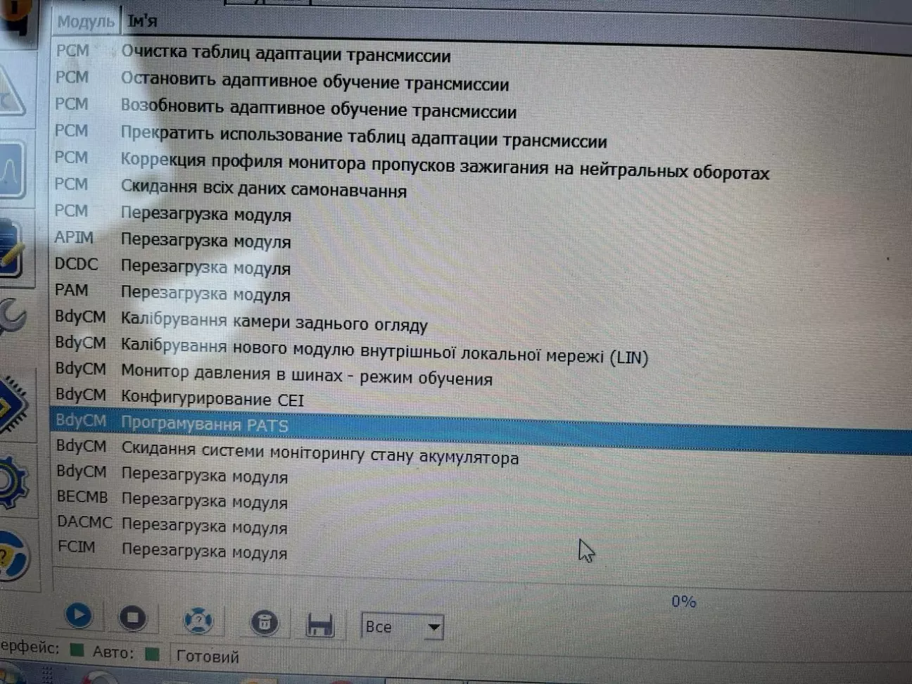 Далі в меню адаптацій шукаємо пункт «BdyCM — Скидання системи моніторингу стану акумуляторної батареї» і запускаємо процедуру.