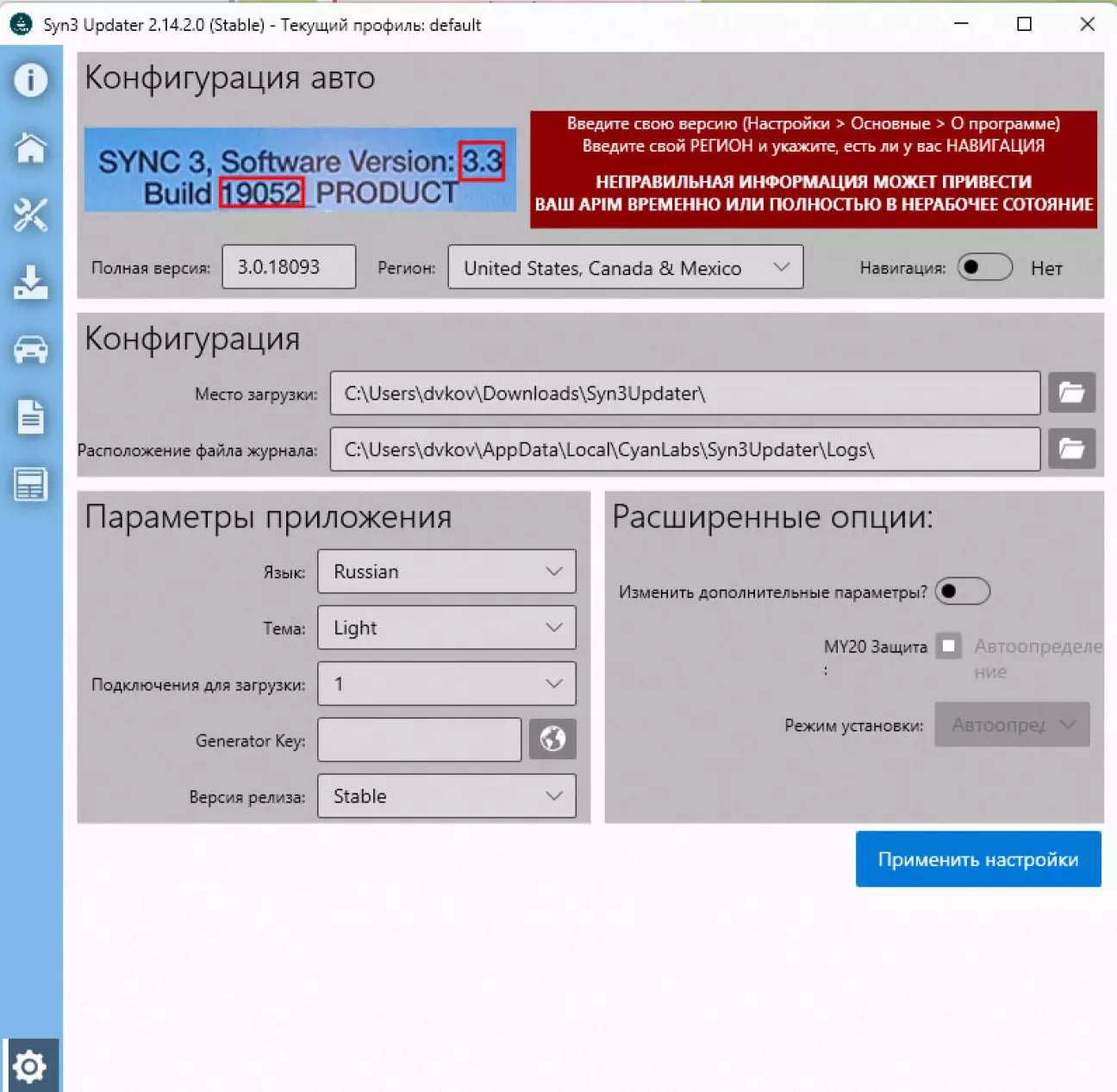 Запускаємо Syn3Updater і на першій сторінці вносимо свою версію Сінк + обираємо чи є у вас навігація. У мене Сінк без наві. Якщо у вас є наві, то ще треба згенерувати ключ з переліком мап які ви хочете встановити.