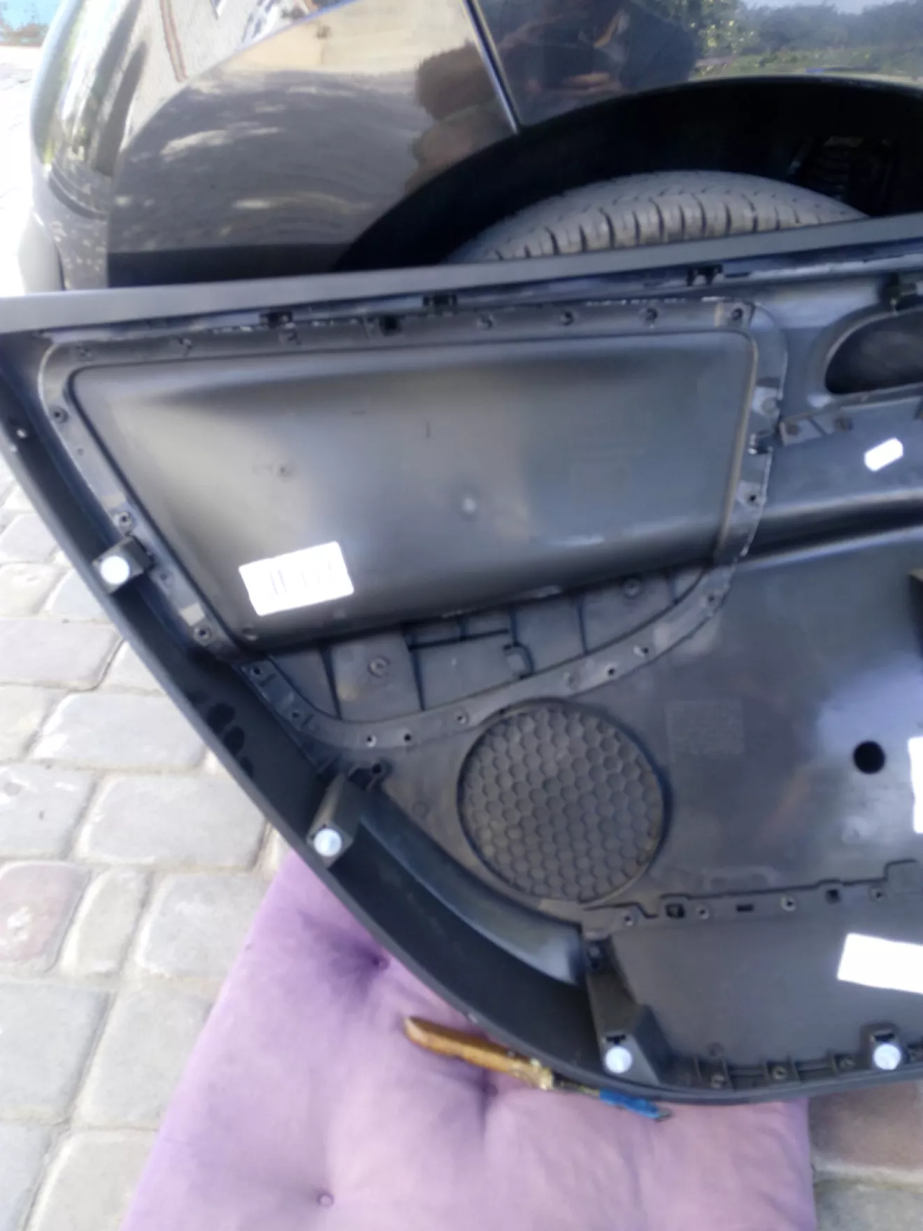 Далее подручным инструментом снимаем обшивку с дверей. Обшивка держится на 7 клипсах, в качестве "клипсодера" использовал лезвие ножа обернутое изолентой.