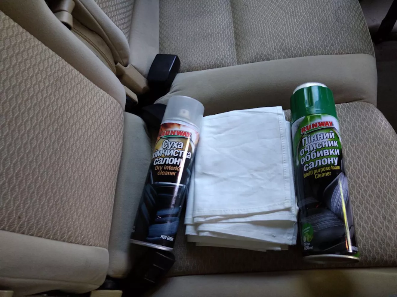 Взял эти два баллона и побольше тряпок, так как до этого изучал уже советы по использованию этих средств) Ожиданий от них не было, хотелось просто убрать следы подтеков на сиденьях, чем-то их заливали конкретно. В сказки не верил и не ждал, что там будет прям чистота) Целью было сугубо немного освежить.