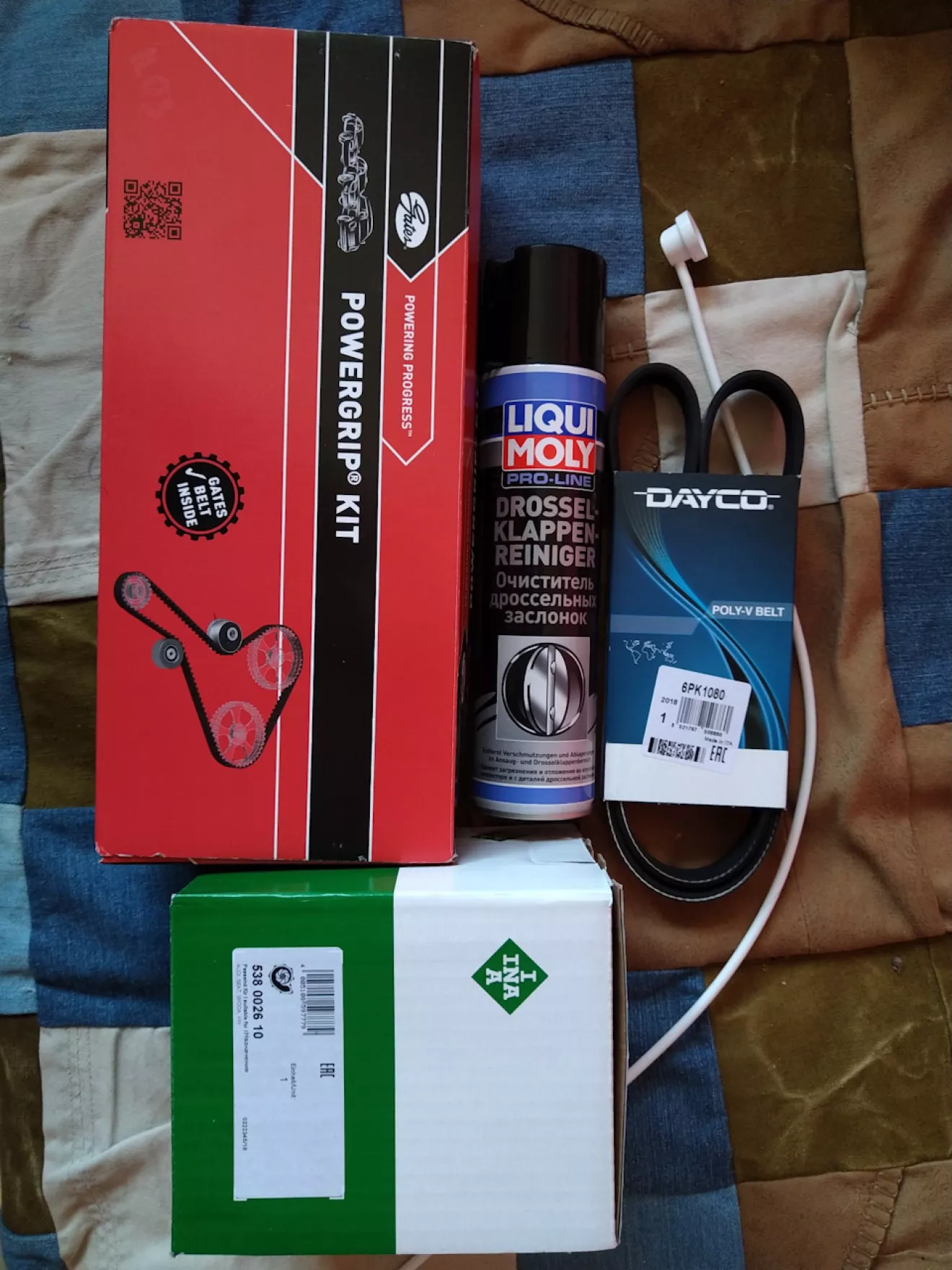 Пришла весна, решил, что пора приводить в порядок малыху. В первую очередь решил менять ремень ГРМ, так как по то, что он начинает морщиться мне говорили ещё чуть менее года назад. Делаю для себя, поэтому решил сразу менять помпу, ролики, поликлиновый ремень. Ибо уже давно это все не менялось (у меня машина уже почти 3 года и ещё несколько лет до этого замен не было). Заодно захотелось и дроссельную заслонку почистить, где-то в интернете попал на статью про эту чудо-жижу от Liqui Moly. Все заказал, заехал на сто, все поставили. Сказали, что в дроссельной уже нормально было отложений, чудо-жижа очистила отлично.