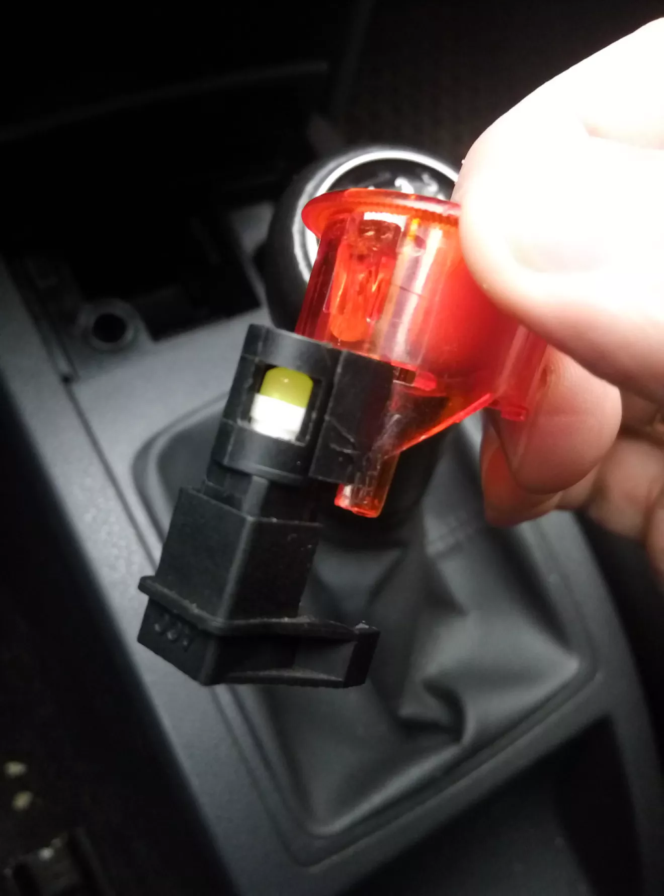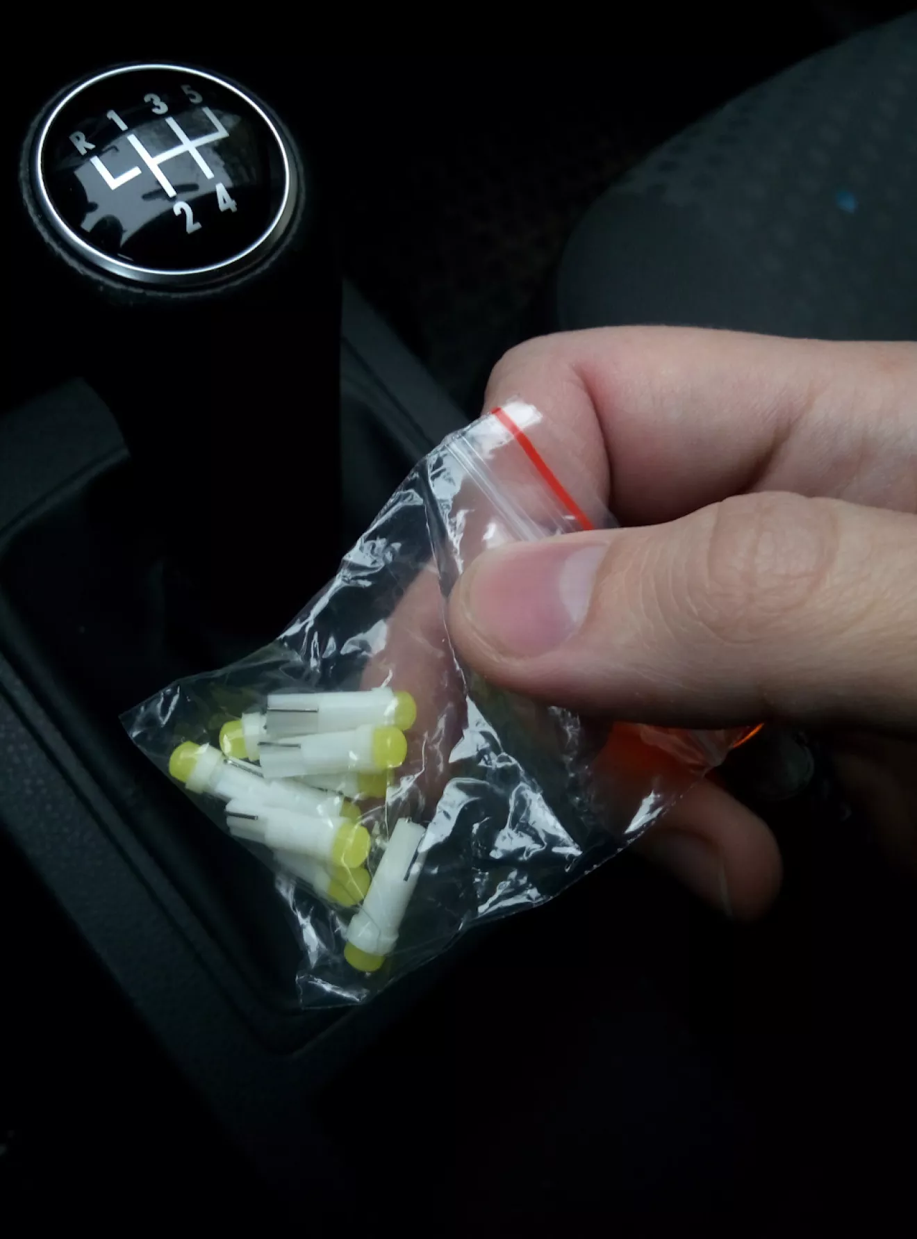 — в прикуриватель взял диоды T5, тоже 10 штук на запас. По записям из других бортжурналов достал внутренность, заменил лампочку на диод. Не пилял, не ламал. Все встало, как родное)