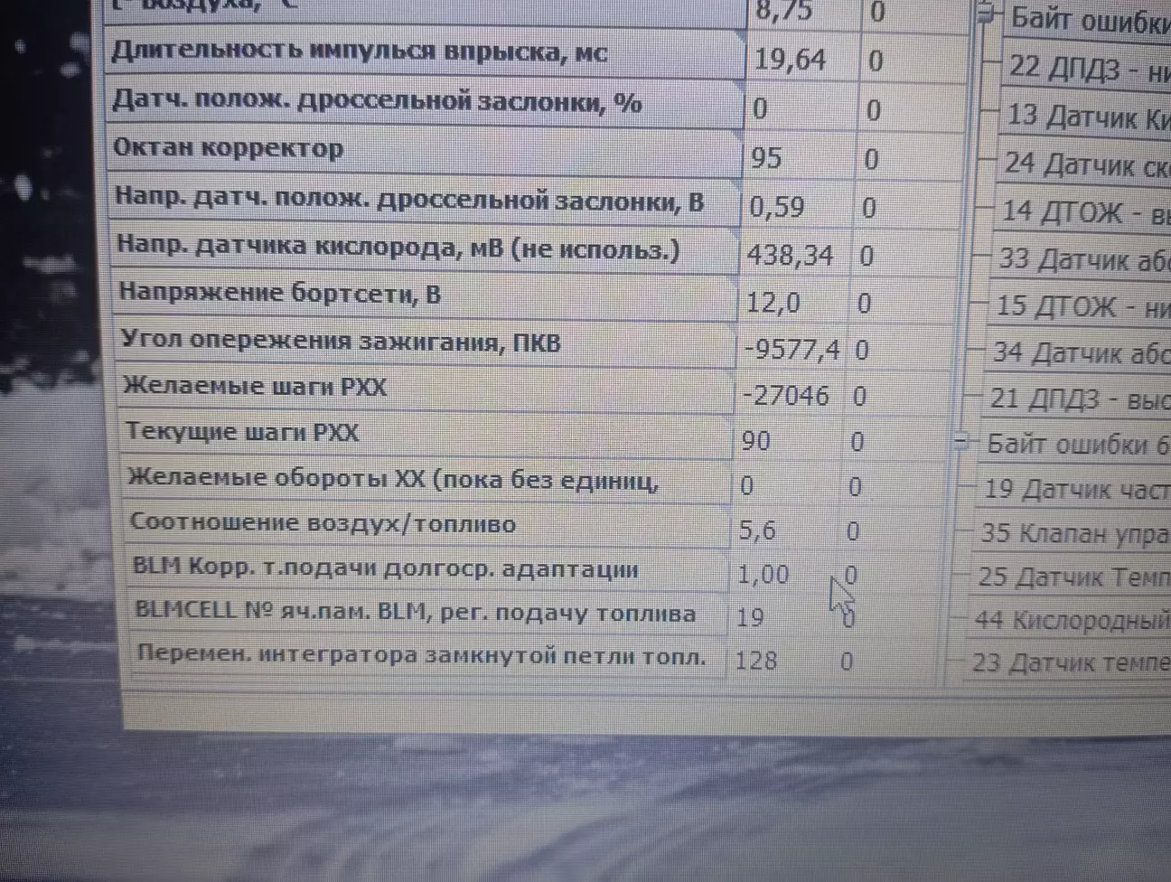 Горить чек, машина не заводиться. Підключив комп'ютер, делко помилок не бачить але при тому "Угол опережения зажигания ПКВ" в неадекватному значенні -9577°