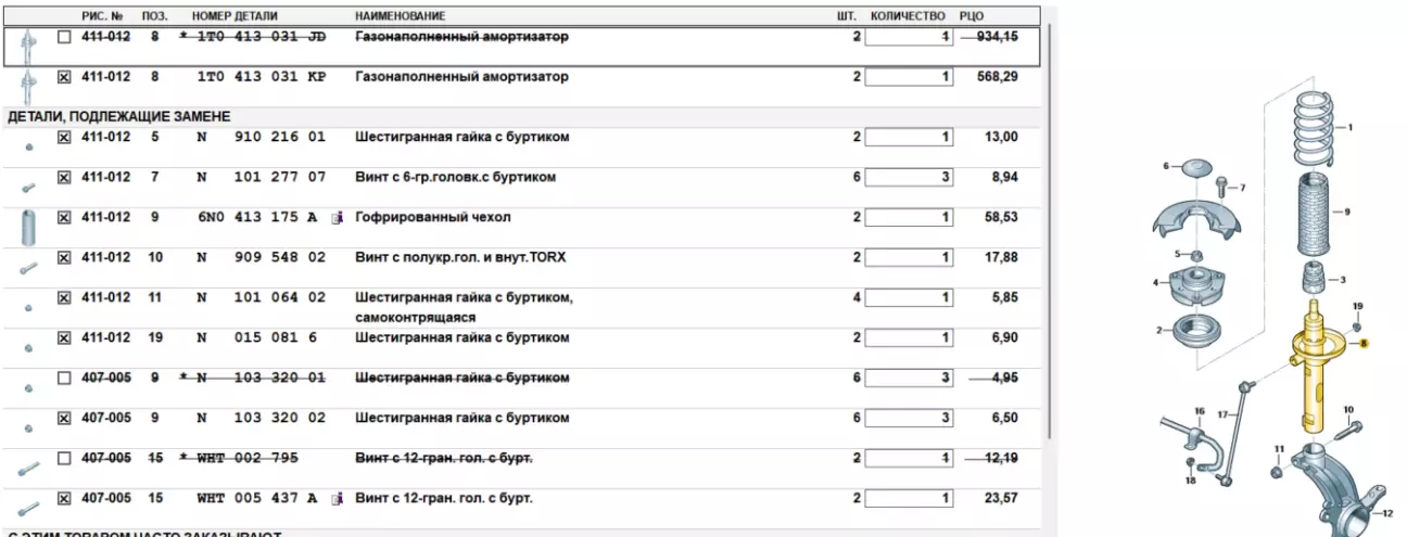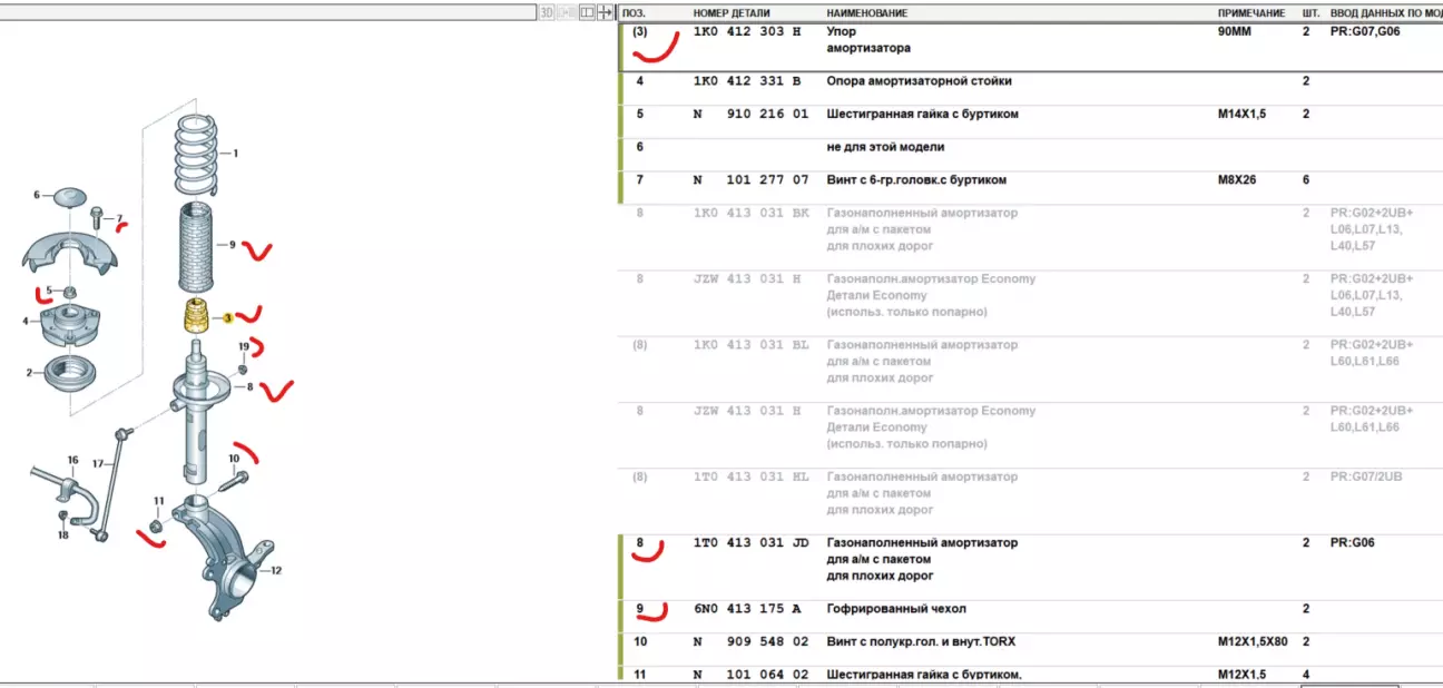 Ось що каже ЕТКА по передній підвісці про амортизатори та їх оточення у моєму випадку: