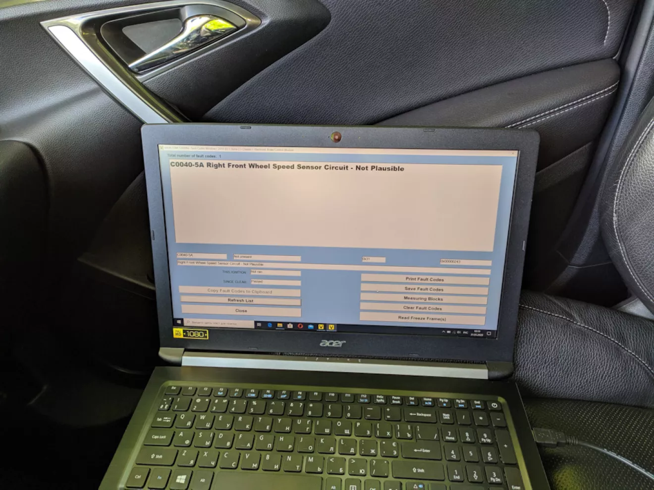 На следующий день прочитал ошибку с помощью OP-COM выдало ошибку C0040-5A Правое переднее колесо Цепь датчика — сомнительные данные. Погуглив информацию по данной ошибке определил два варианта причин: