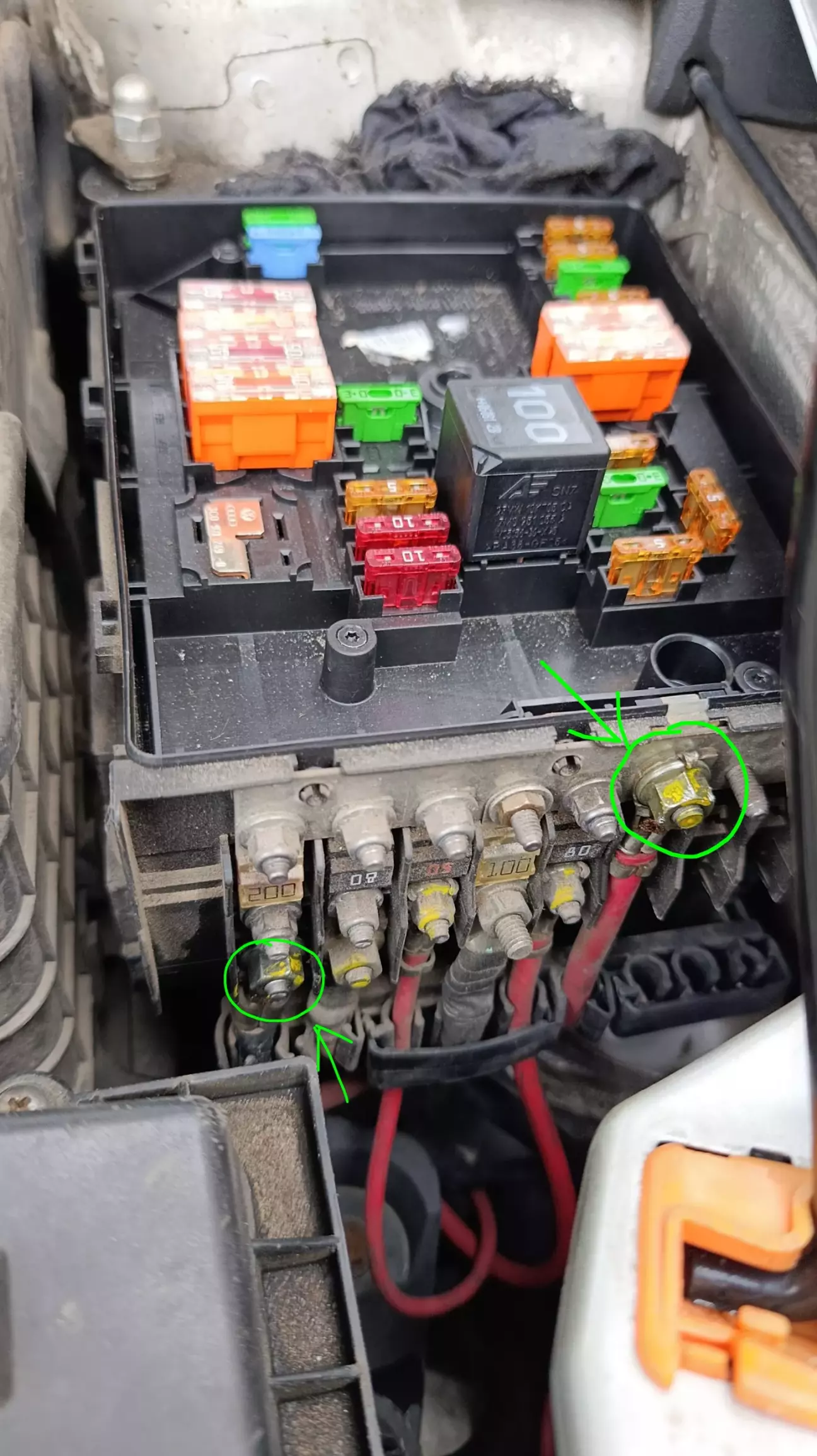 Доброго дня, шановні читачі.Днів 10 тому в мене почали зависати підвищені оберти хх десь на 1040-1060. Помилку ту що потрібно одразу не побачив. Мій друг порадив почистити дмрв, каже в нього теж таке було. Знайшов час зняти датчик, загуглив як чистити, рекомендують або спеціальним засобом, або спиртом. Промив я його спиртом з маленької бризкалки, з нього витікав бруд. Акуратно протер пластину ватною паличкою зі спиртом, ще купа бруду витікла. Як висохло, поставив на місце. День покатався, холостий був в нормі і я подумав що вже переміг, але наступного дня проблема знову з'явилася. Тоді вже в мене вистачило розуму більше детально подивитися помилки і побачив я помилку по акумулятору 01598. Погуглив, пишуть перевірити силові дроти акумулятору та генератору, хтось навіть міняв їх. Дроти я передивився, надломів і зменшеного перетину не побачив. Зняв клему з акума та відкрутив дві гайки на блоці запобіжників одну силового провода з генератора, іншу з акума. Все побризкав контактклінером, постояло, протер і ще раз повторив процедуру. Затягнув гайки, затягнув клему і вже четвертий день все в нормі. Ось на фото гайки силових проводів, що відкручував: