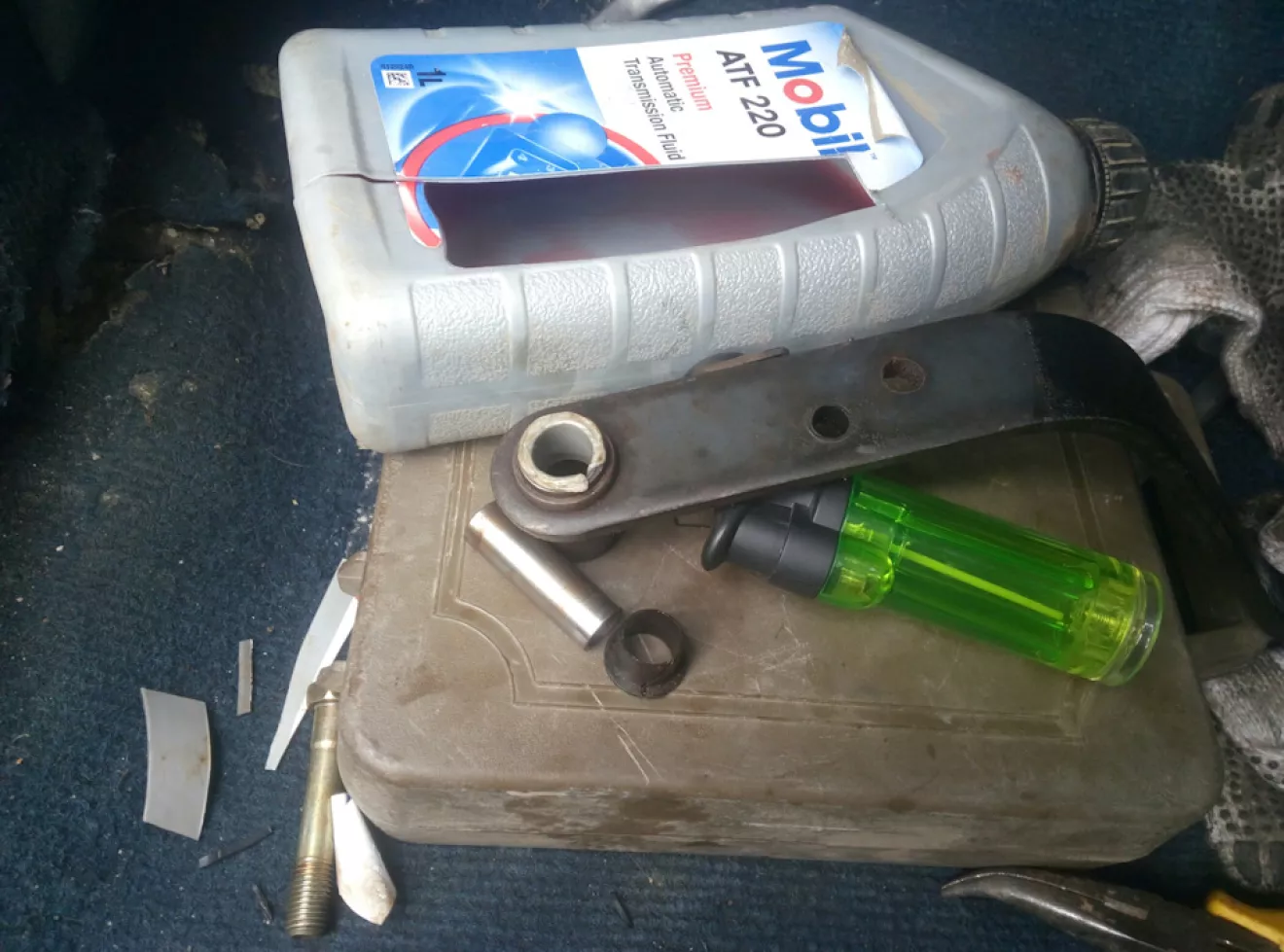 В общем надоело мне смазывать скрипящую педаль всякими там аэрозольными смазками и я решил закончить с этим на всегда, хоть и колхозным методом. Снять предать оказалось очень просто, не смотря на то, что описывают в интернетах. Нам нужен ключ на 14 в идеале трещётка, но у меня были только накидные, плоскогубцы нож, горелка или фен и пластиковая тара (всё на фото). При снятии педали не надо её сразу тянуть вниз, она заводится со стороны капота, немного вперёд и она сама прекрасно выпадает, кстати устанавливается в обратном порядке точно так же легко. Процесс снятия и постановки описывать не буду, а вот про изготовление пару слов надо.
