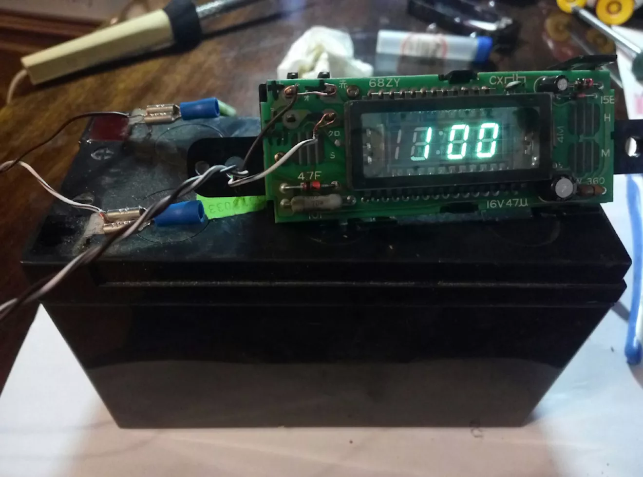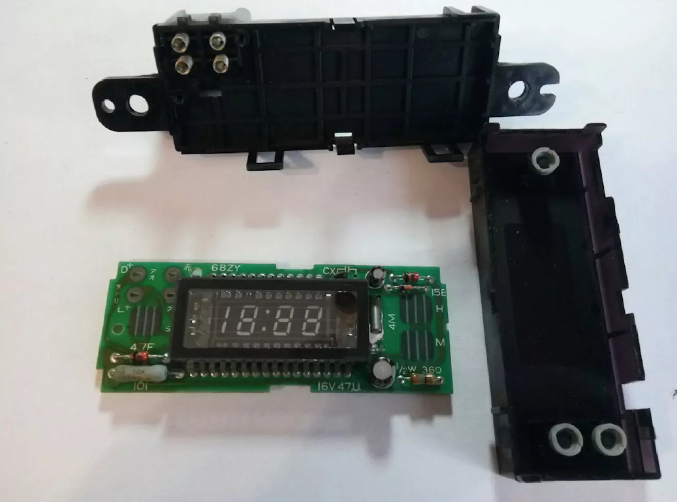 В общем решил я все таки восстановить работу часов в салоне автомобиля. Начитавшись о проблемах с микротрещенами решил разобрать панель и пропаять часики. Как разбирать панель фото отчёта делать не стал, т.к. это элементарно: откручиваем 2 шурупа вверху панельки и вытягиваем всё на себя. Далее снял часы, ламели и помыл всё, что можно мыть, а вот по часам стало всё гораздо интереснее: пропаял, подключил навесным монтажом к аккумулятору — работает, думал, что чудо. Принёс всё в сборе в машину, подключил — не работает. Как оказалось — на часы не приходит + с зажигания, но приходит + от включения освещения. Огорчился я, но искать пробой я не стал, т.к надо разбирать половину торпеды и уже дело близится к ночи, решил просто поменять пины в разъёме. В итоге часы светятся только при включении габаритов/света, этого мне пока достаточно, тем более я их практически не выключаю при движении.