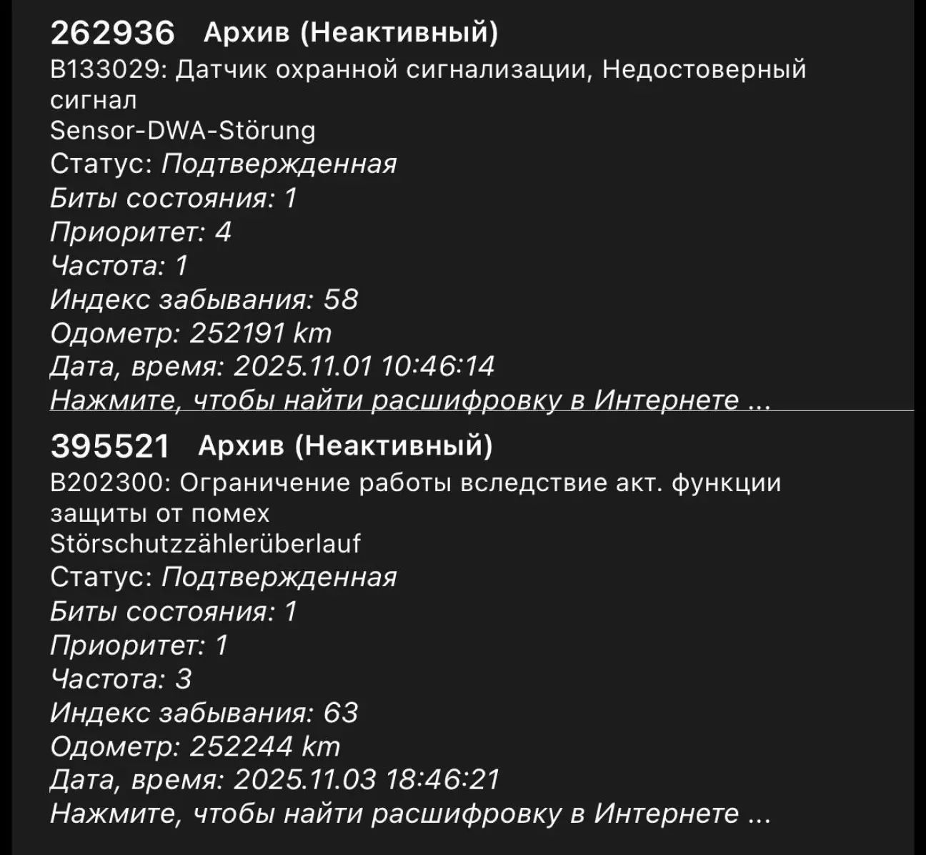 -При діагностиці з’явились коди помилок: DTC 262936 B133029 - Датчик охоронної сигналізації, недостовірний сигнал та DTC395521 B202300 -Обмеження роботи через активну функцію захисту від перешкод.