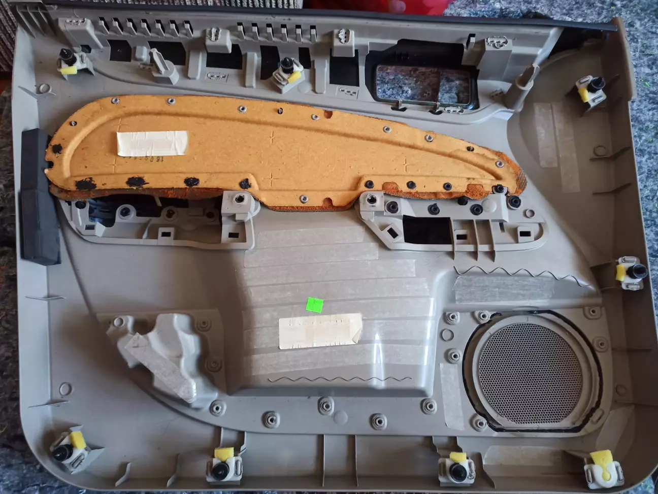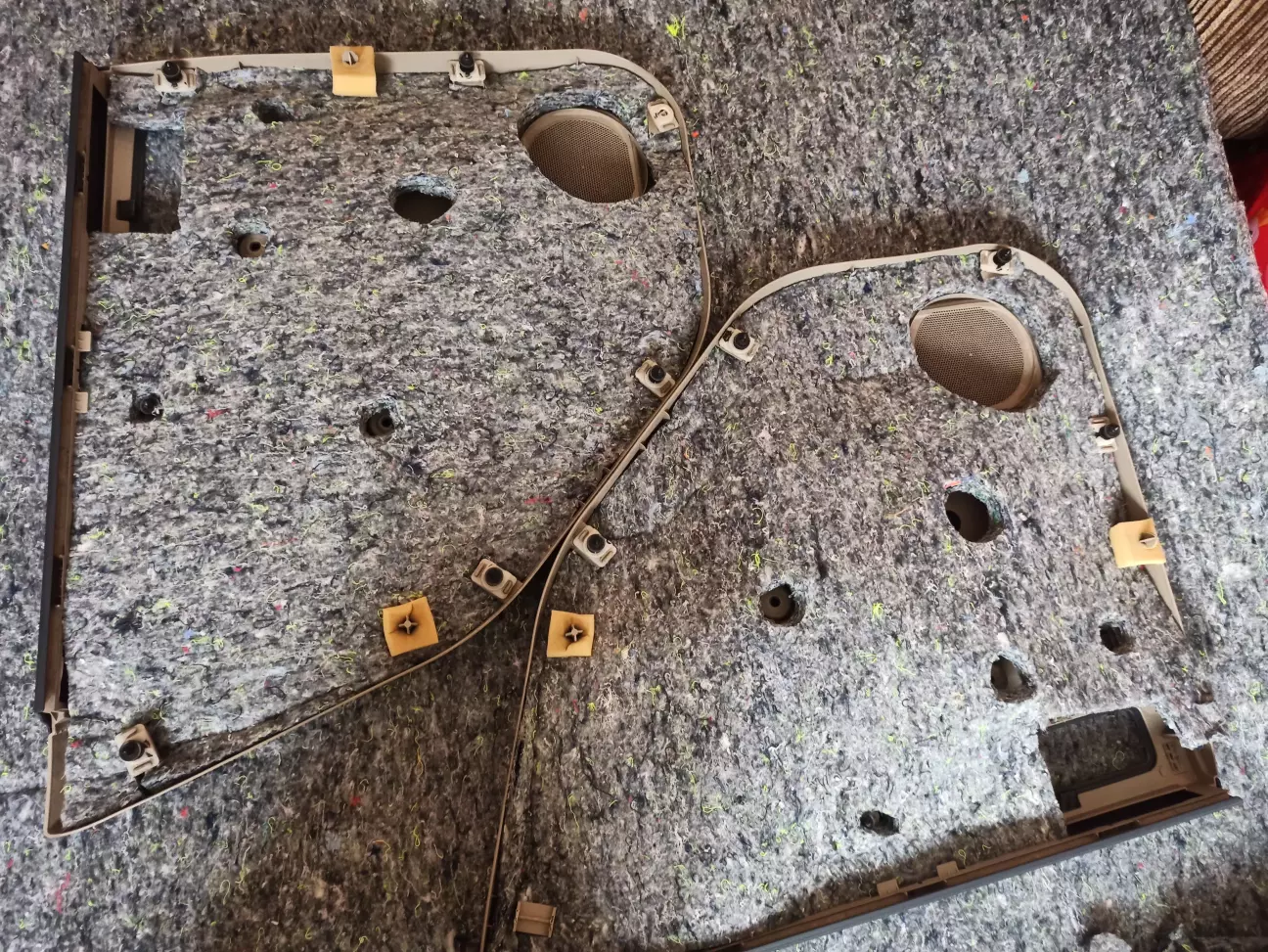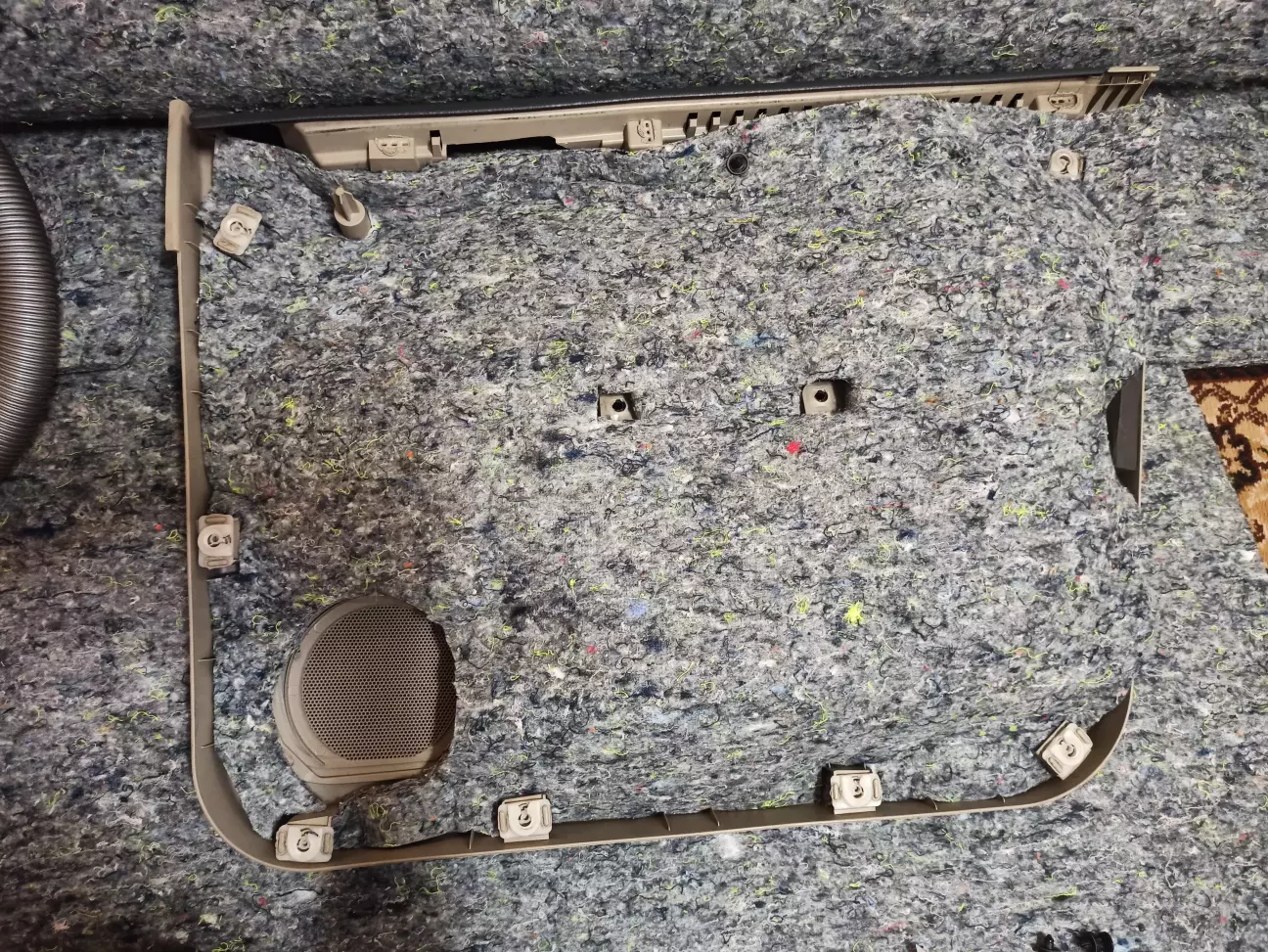 Тому знявши дверні карти, я їх трохи модифікував. Поліуретановим герметиком пройшов периметр стику решітки динаміка до самої карти. Під кожну кліпсу кріплення поклав тонкий лист паролону. Авто вже 20 років і демпфери кліпс вже майже не демпфери. На іншому авто це дало результат, тому я використав цей підхід і тут.