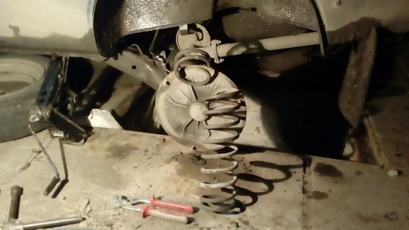 Ещё как купил машину балка гуляла и немного водило зад на ходу, только сейчас дошли руки до этого, решил заменить сайлентблоки в балке и в амортизаторах, ну и давно были мысли по поводу занижения, в этот раз решил уже окончательно, спилил 2.5 витка, вид конечно бомба но пока что только зад занижен, передок буду занижать на выходные)
