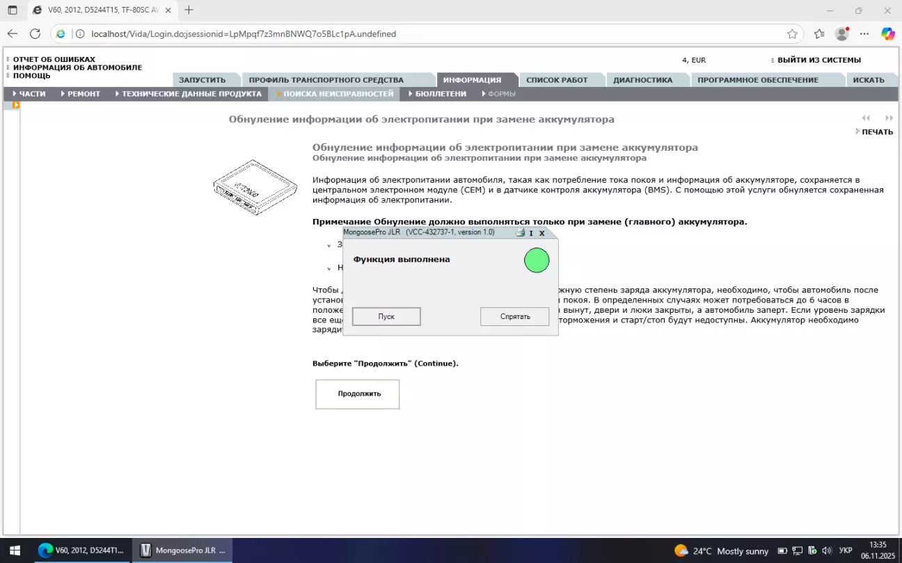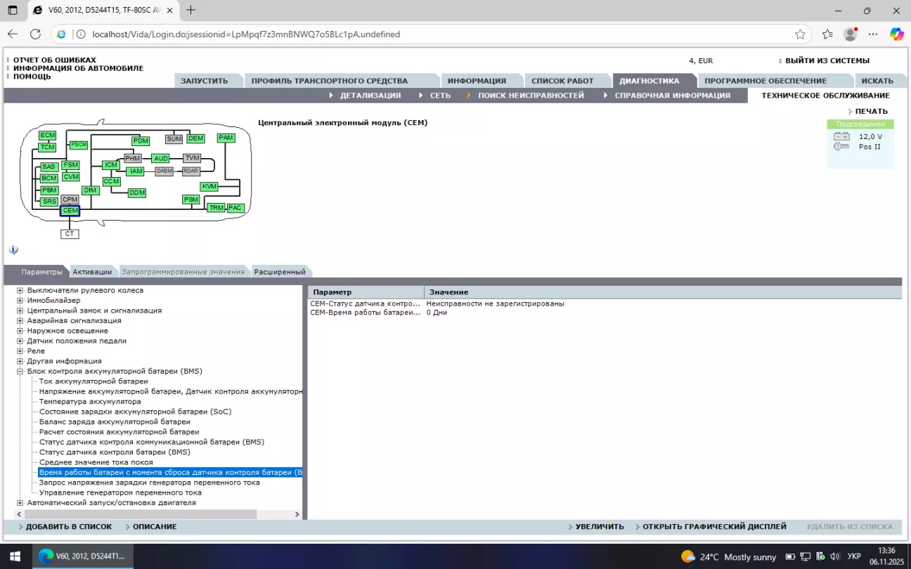 І звичайно, підключаю VIDA. В ЕСМ знаходжу пункт сервісної процедури про обнулення інформації по живленню після заміни АКБ і запускаю саму процедуру. Пару секунду і усе зроблено, тепер вже авто знає, що встановлено новий АКБ і за рекомендацією у VIDA (в описі процедури) залишаю авто в стані спокою до наступного дня.
