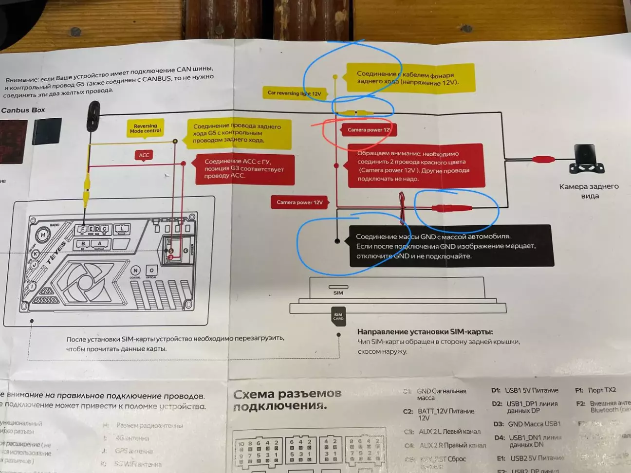 Схема підключення камери була в комплекті з мультимедіа та підходила скоріше для комплектної камери. Але оскільки камера була іншої моделі та виробника, я зібрав свою схему.