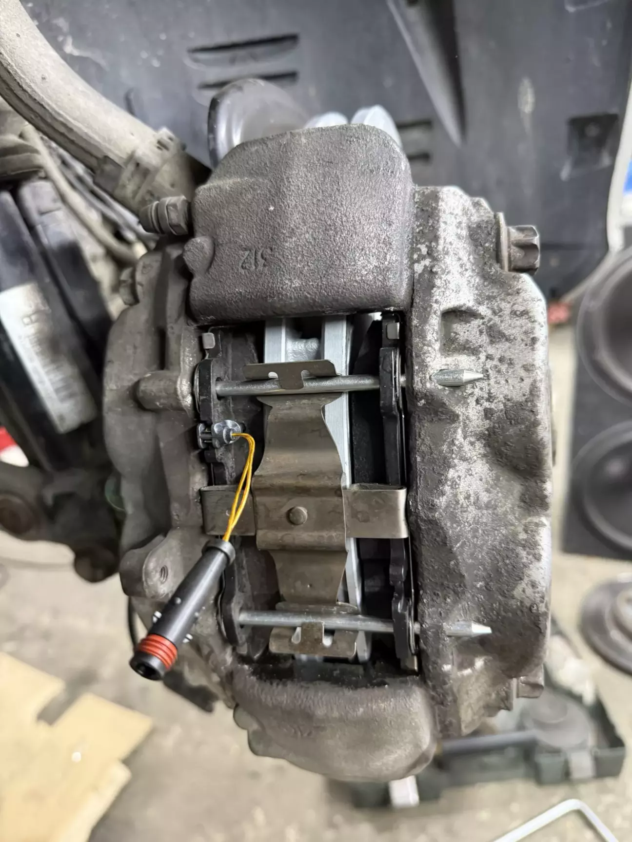 Єдине виник нюанс з монтажним комплектом колодок, пластина виявилась чуток більшою і не піджимала колодки, а впиралась і суппорт, тому прийшлось залишити пластини старі (добре хоть вони були цілком живенькі), замінили лише штифти