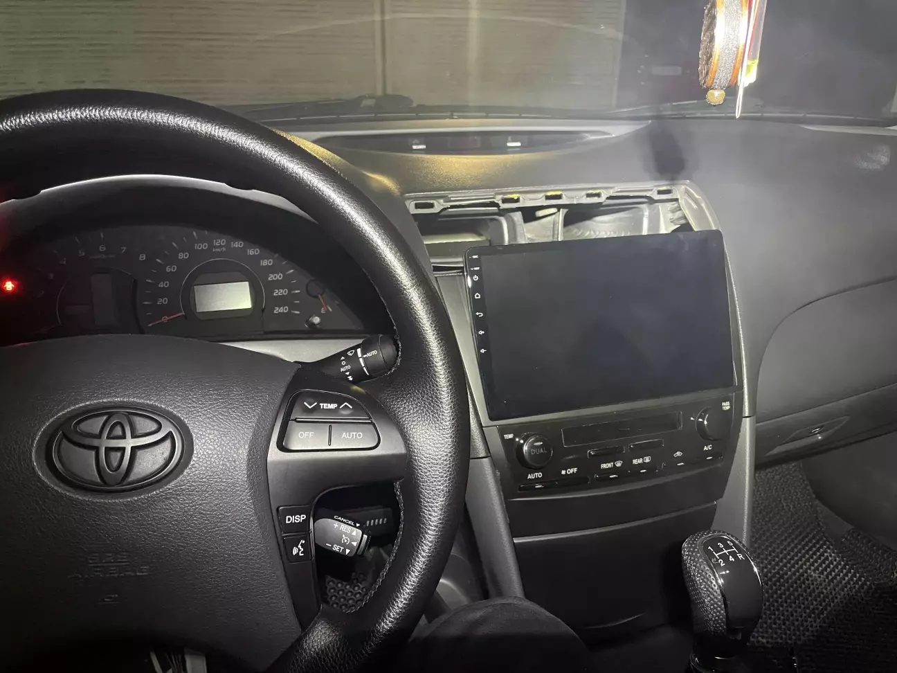 Проміжний варіант, камера вже була(дужа стара, колись на торпеді стояв малий екран) вирішив поки її залишити, але чомусь вона не коректно працює. Підключав по схемі, постійно світиться задній хід😟Чому так поки не зрозумів, та і навіть коли вмикаю задню, наче б то повинно на весь екран вмикатись камера, але цього не відбувається…. Напевно щось з підключенням коси в багажнику. Буду з цим розбиратись….