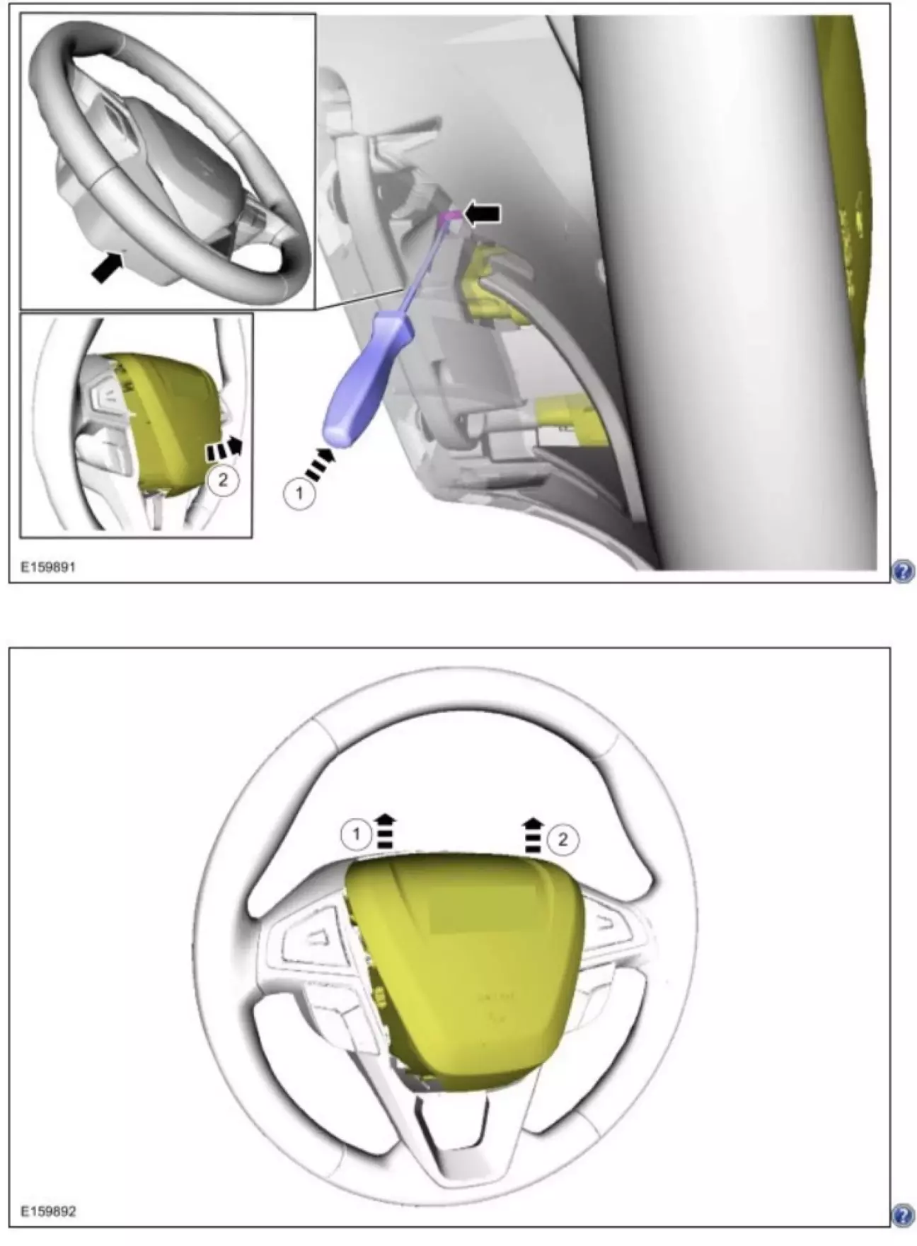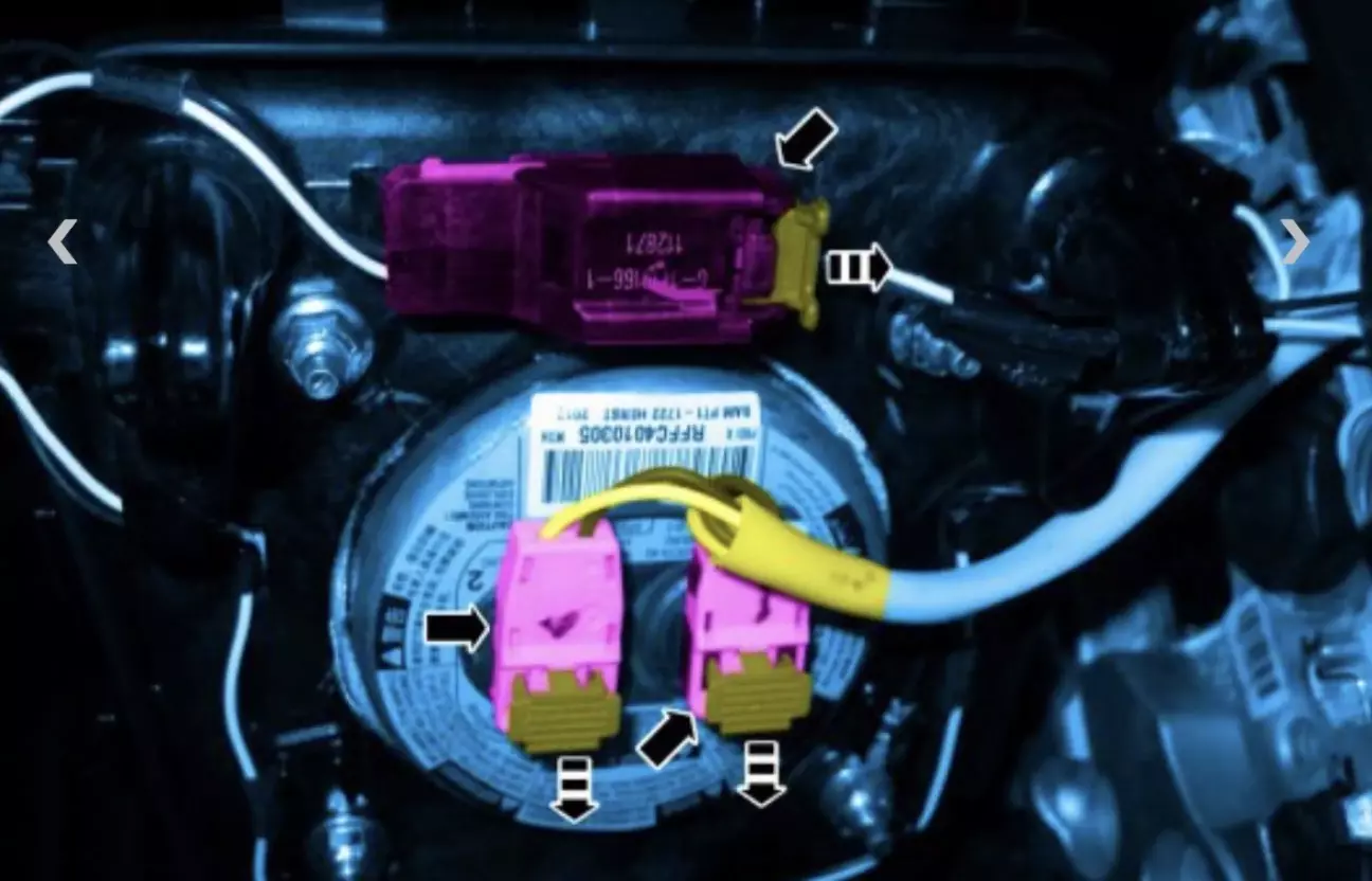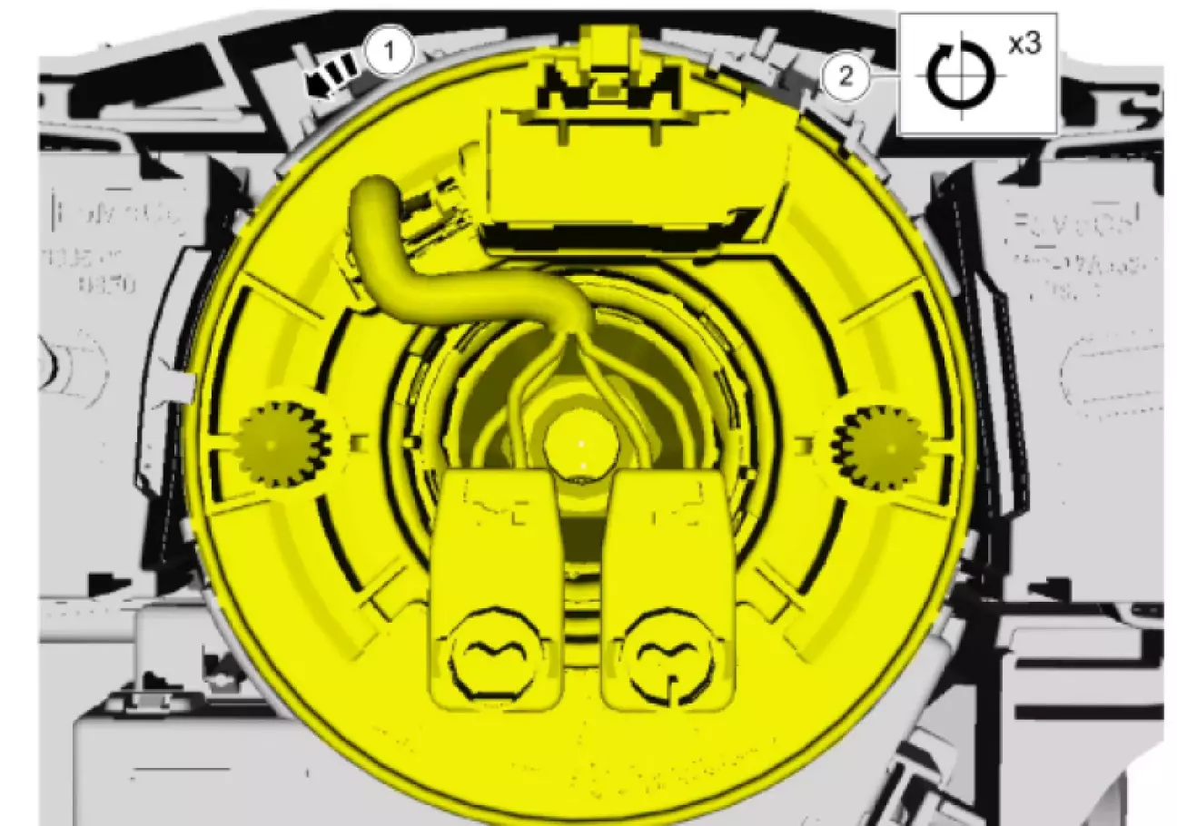 Знімаємо клему АКБ щоб подушка не спрацювала випадково. Для зняття подушки руля треба тонка викрутка чи шестигранник, знизу є отвір, тиснемо на пружину і низ подушки відкривається, верх подушки тримається на двох гачках, коли низ вільний можна натиснути на верхні пружини. Далі треба відʼєднати клеми піропатронів, спочатку піддіти запобіжник, а потім відʼєднати саму клему.
