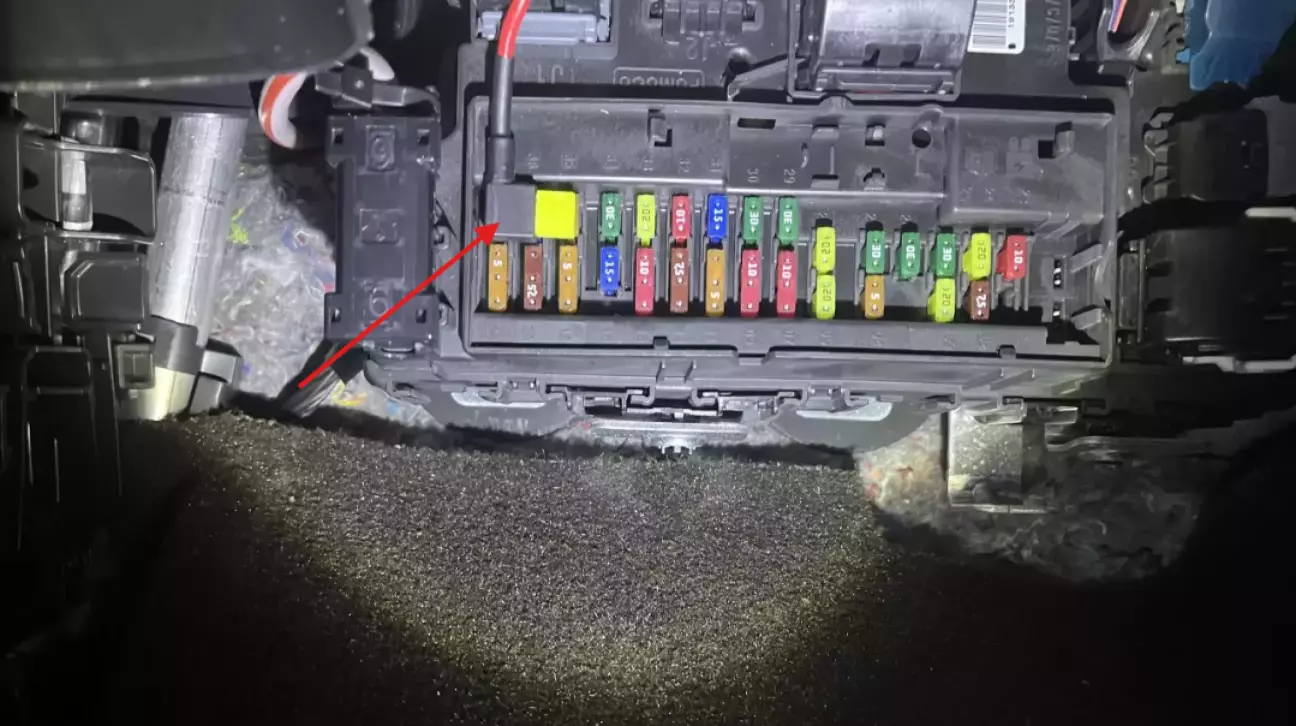 Плюс тягнемо до запобіжників. На лінку не дуже зручно щось довстановлювати, всі елементи дуже щільно запаковані, навіть шпаринки нема. Протяг плюс вздовж трубчастого підсилювача, його відразу видно як заглянути знизу. Щоб дістатися до запобіжників, які знаходяться в ногах пасажира, треба зняти панель, яка тримається на трьох пластикових кліпсах типу ялинка, просто тягнемо їх вниз, також треба зняти ліву панель в ногах пасажира, так буде зручніше, вона теж на кліпсах.