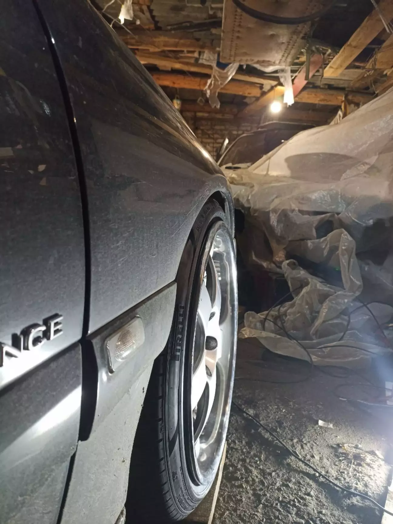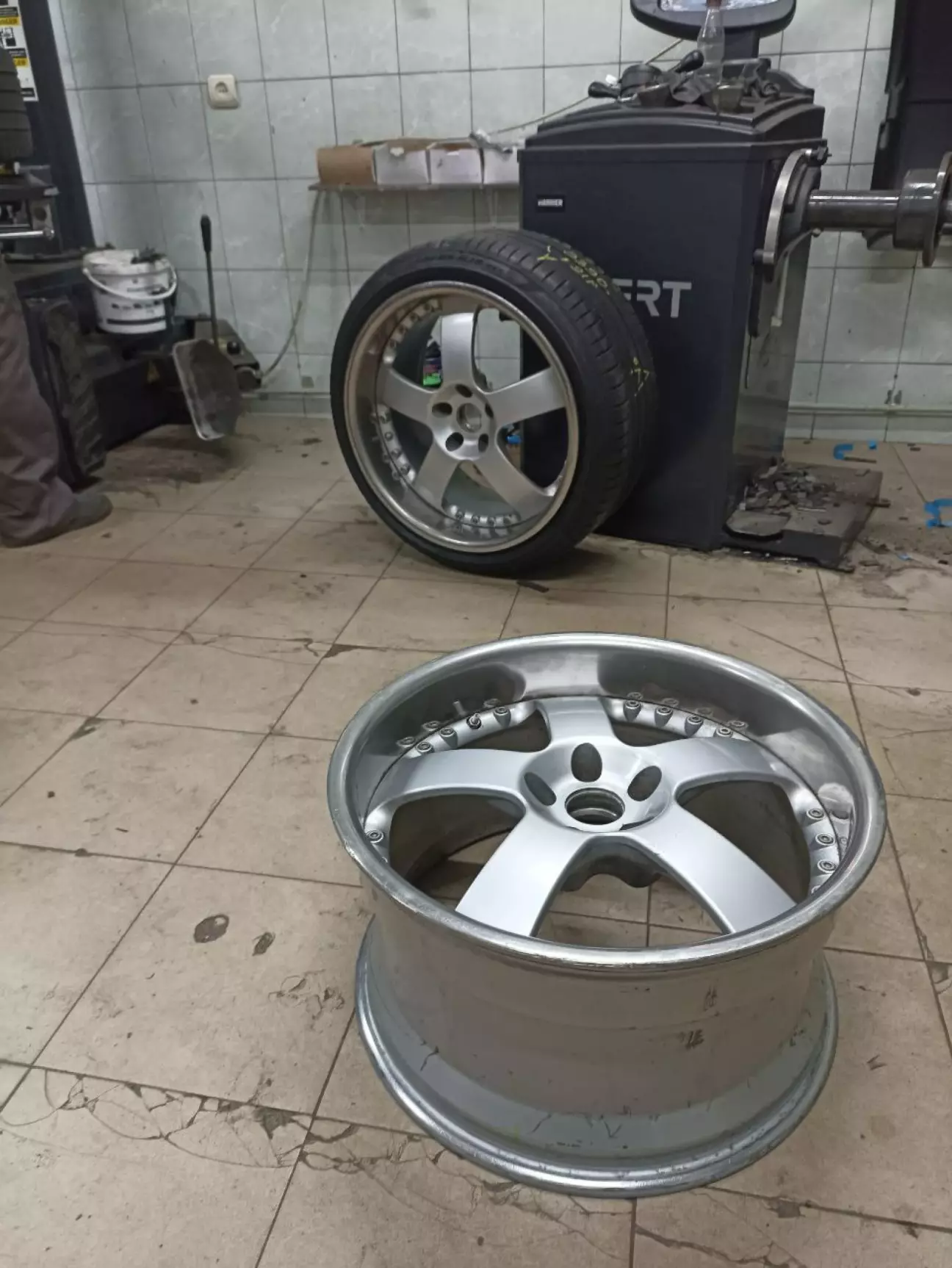 Начал выбирать резину. Из-за конструкции стойки амортизатора спереди, по высоте резины сильно не разгуляешься. Так-же из за ширины самих дисков и их вылета спереди, учитывая что установлены пружины с занижением, необходимо было подобрать резину поуже, что бы шина стала немного в натяг, "домиком". Хотелось 225 45 на перед но посчитав в калькуляторе шин, понял, что не станет по высоте - упрется в чашку стойки.