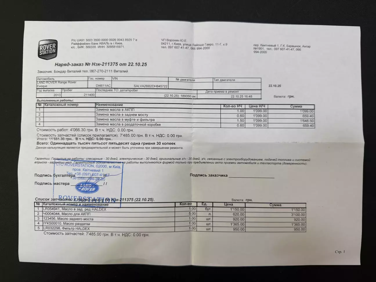 Всім мої вітання, на днях провів планове ТО по заміні мастил в АКПП, мосту, роздатці. Великий плюс є прозора історія авто і всі контакти попередніх власників. Авто обслуговувалось в Києві на рендж сервісі тому вирішив не міняти нічого і звернувся до них з проханням провести діагностику авто і подивитись що вже потрібно міняти по регламенту. Залишив авто вранці і ввечері її забрав, все швидко і якісно. Рухаємось далі, всім миру та злагоди.