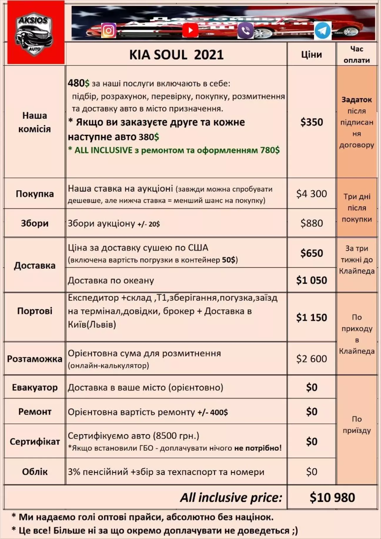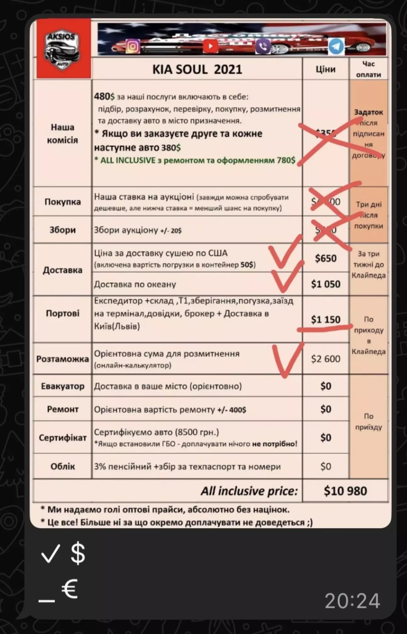 Звернувся за порадою до свого родича який мегі порадив саме одну фірму яка займається пригоном авто зі штатів, нібито він проганяв собі авто, його кум, та деякі родичі і залишились задоволені купівлею автомобіля, тому я теж вирішив звернутися до них. В цілому поки залишаюсь задоволений бо обіцяні витратити співпадають з заявленими на 90-95%. Єдине про що не сказали, так це про розрахунок за логістику від Литви до України не в $ як в прайсі а в €. Тут начеб -то нічого страшного але 1150$ та 1150€ по курсу на сьогодні трохи відрізняється, розумію що це не саме страшне але факт залишається фактом.