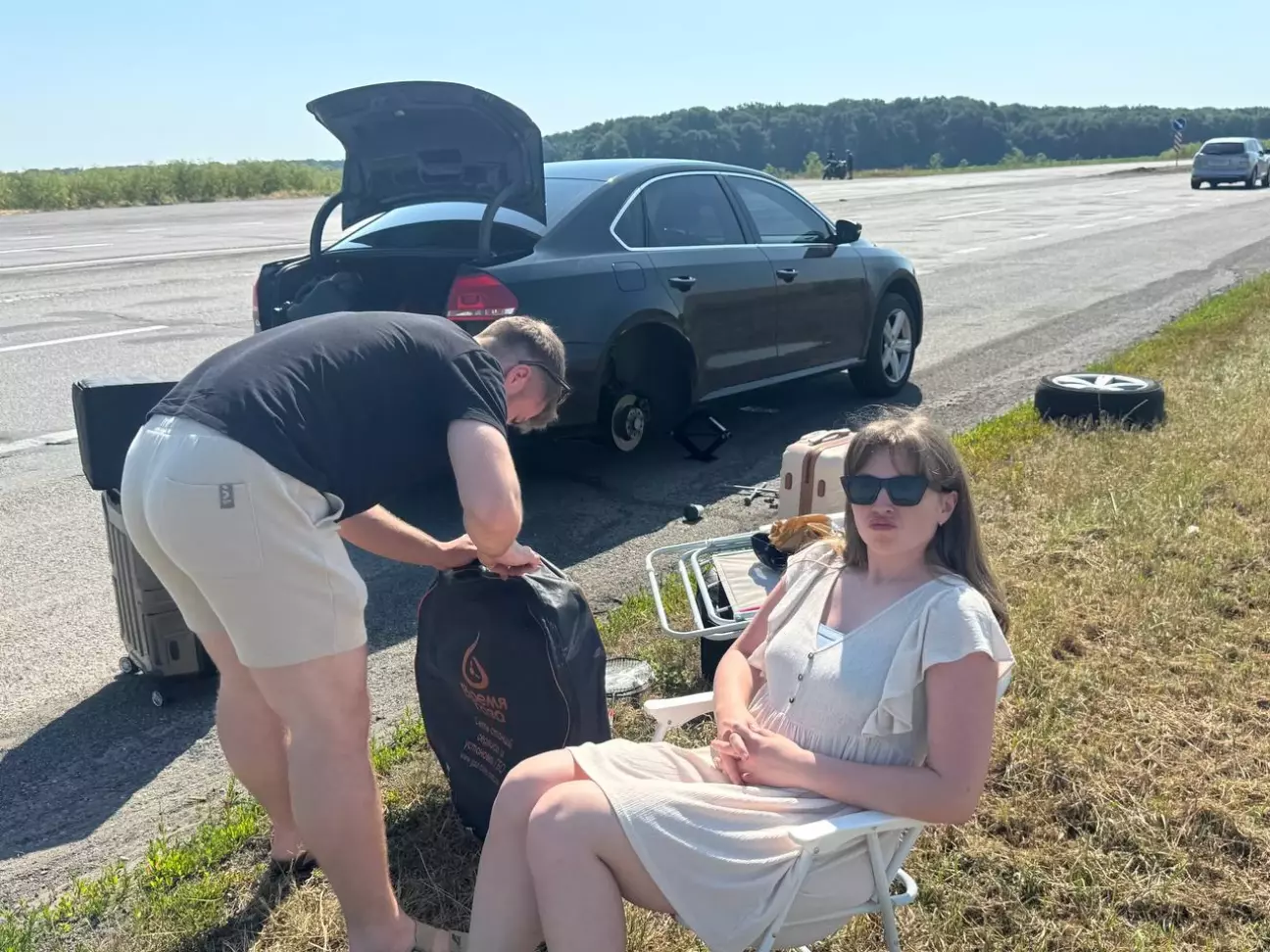 Ми їхали втрьох, і посеред траси за 30 км до Умані в нас спускає колесо - подвійний прокол. Це не зіпсувало настрій, але відняло пару годин дороги. В Умані придбали пару покришок "на допал", думав з наступного сезону нормальну резину на літо брати, але ця тимчасова нам ще покаже потім викрутаси😀
