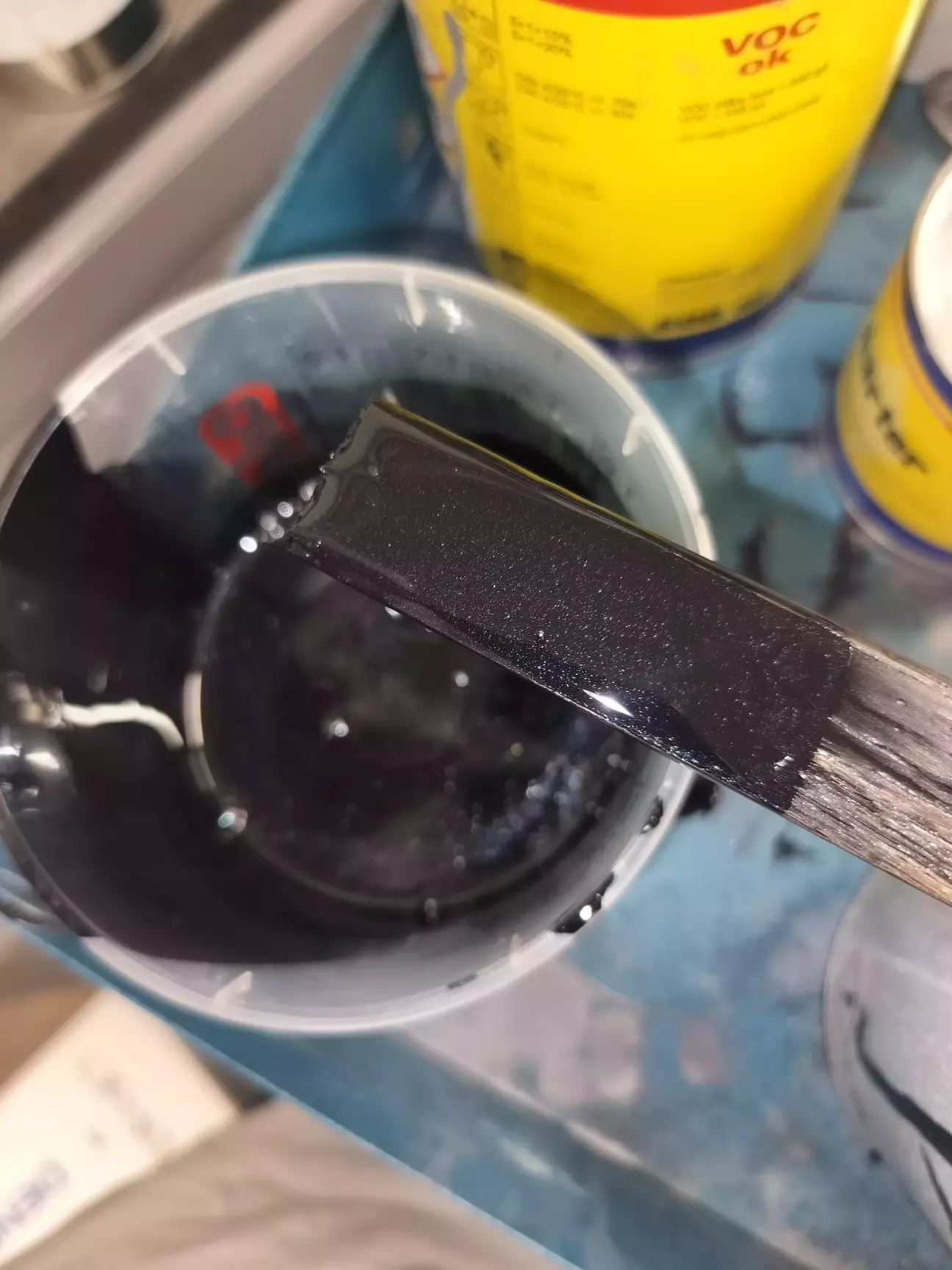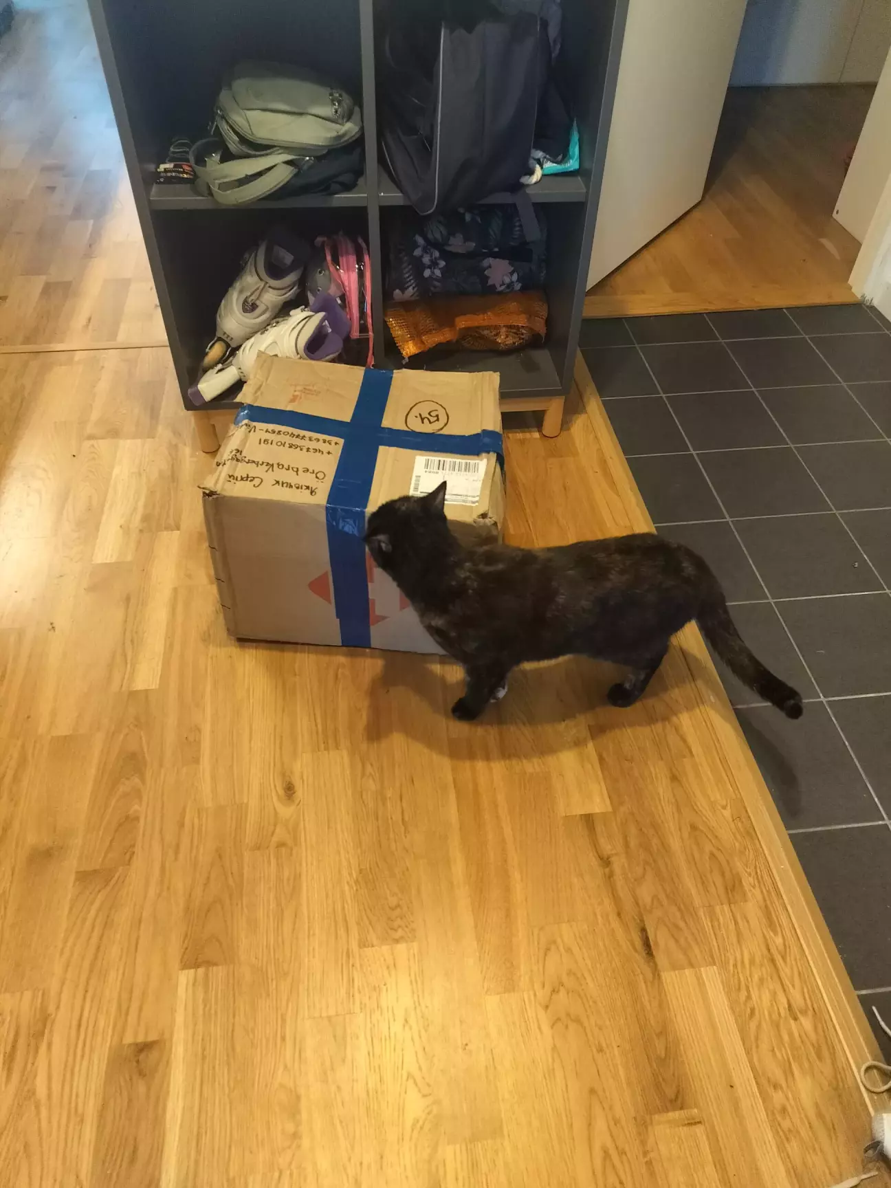 Хвостата обнюхує посилку з фарбою, що приїхала з Одеси. Фарба в Швеції дорога. Дуже дорога.