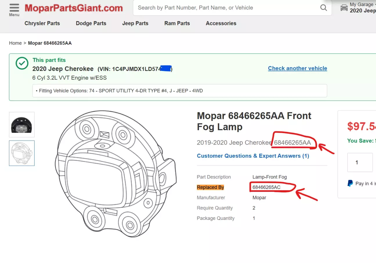Тепер для самих допитливих. Але як же ж так виходить, що птф-ки зовні виглядюають по-різному, наче перевернуті догори дригом? Виявилось що навіть в процессі випуску моделі чірокі деякі деталі в різні роки були випущені в новому форматі і під новим кодом. І можуть виглядати прямо по-різному. Але виконувати однакову задачу. В мене навіть по моєму віну для моделі авто вказано що деталь Replaced By і інший номер.