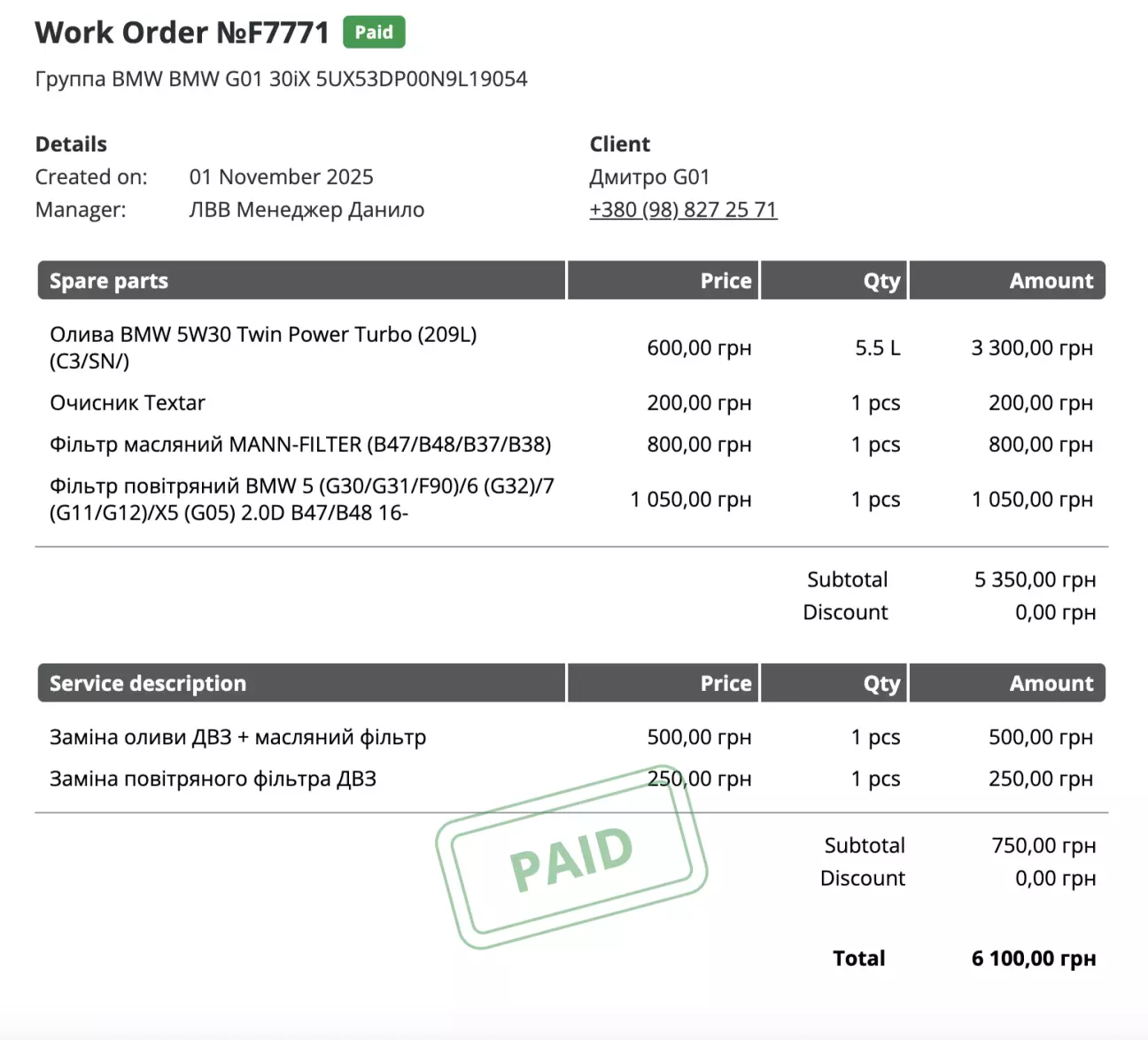 GarageRacer дають модний онлайн акт виконаних робіт, який приходить за посиланням в смс