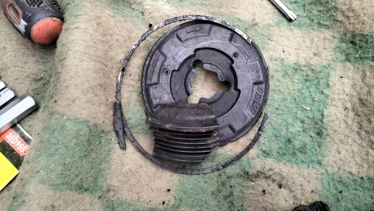 В дорозі стала така біда. На трасі, за 350 км від дому розвалилася муфта компресора кондєя. Добре що поряд був населений пункт.