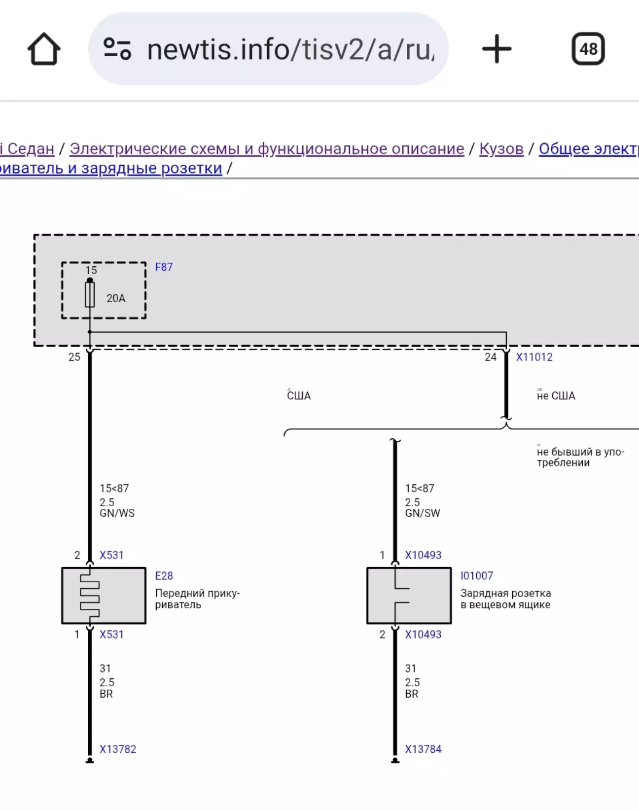 Дивлячись на схему бачимо GN/WS (зелено/білий) провод підписаний 15<87 (15 клема - плюс від запалення, через 87й запобіжник) під'єднаний до блоку задніх запобіжників (А46) через роз'єм Х11012, 25й пін.