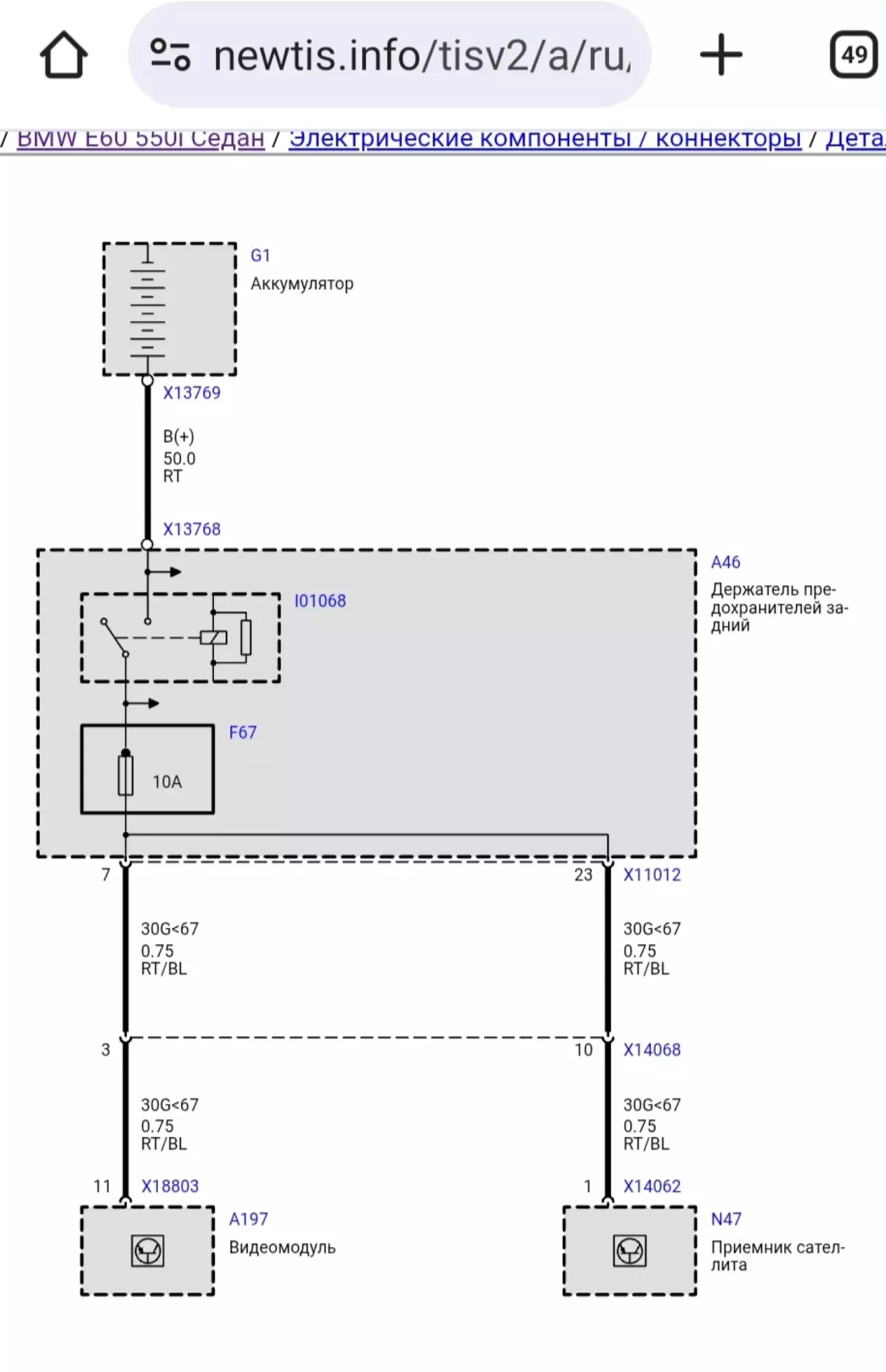 Знаходжу поряд пусте місце під ідентичний пін 23. Мало бути живлення на "Приемник сателлита", що то таке не знаю, на моєму авто відсутнє. Позначається як 30G<67 (засипаючий плюс через 67 запобіжник). Так цей запобіжик на 10А замість 20А в стоці, але мені вистачить, буду мати на увазі. На цьому запобіжнику може висіти також Відеомодуль, але такий у мене відсутній.