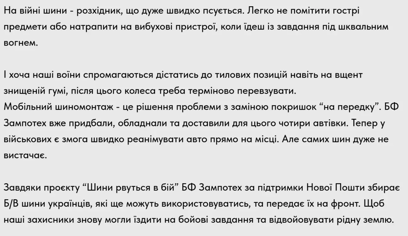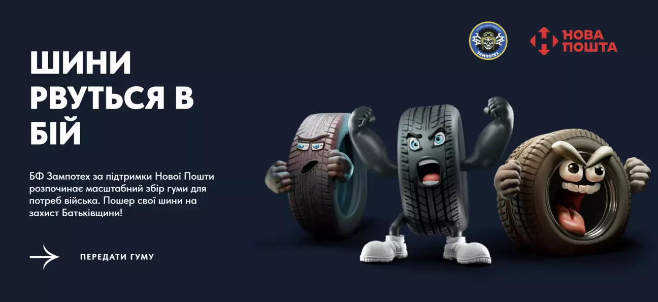 БФ Зампотех шукає різні шини у різній кількості. Не обов’язково передавати цілий комплект. Відправите одну – чудово. Дві – ще краще. Три, чотири – взагалі супер. Не буває маленьких донатів!