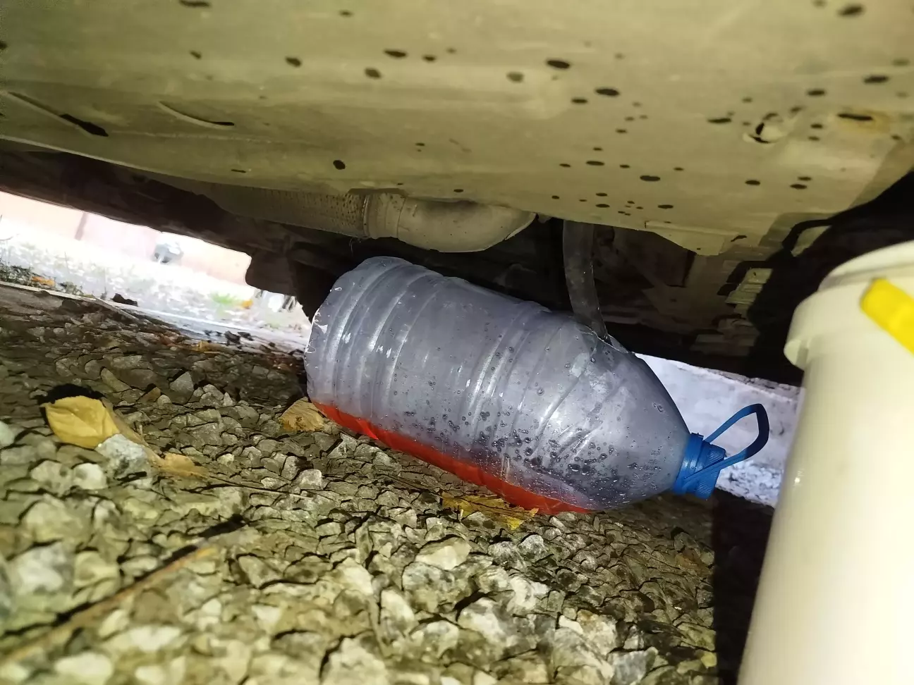 Додатково порожня 5 л пляшка і відерко для зливу старої рідини, гумовий шланг, ліхтарик)