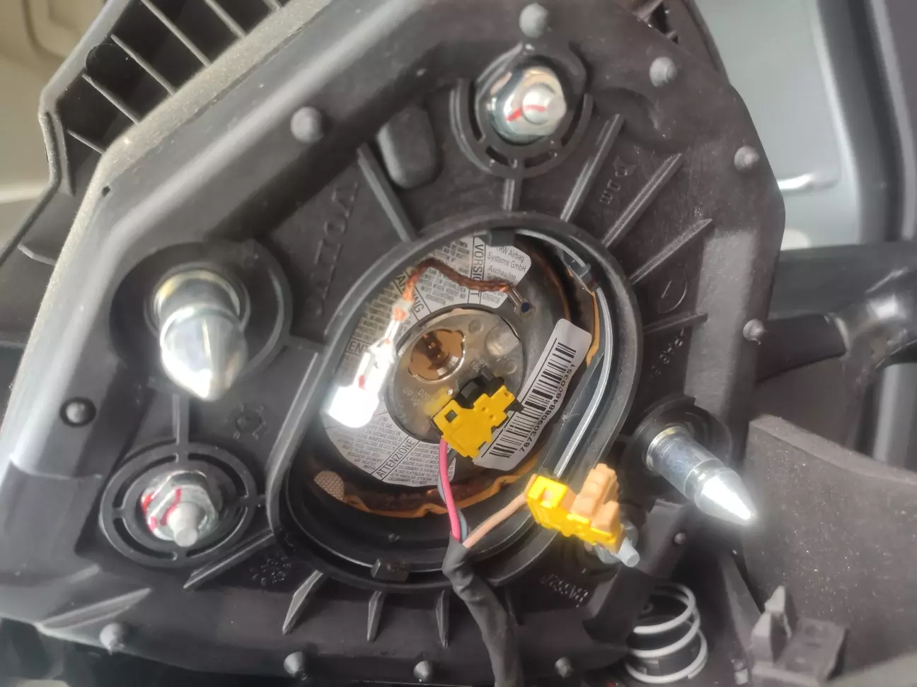 Виглядає не ок, але якщо зняти білу заглушку по центру, то внизу буде видно два стандартні роз'єми для піропатронів (як на дорестайлінговій подушці). Відповідно кусок проводки з оранжевим роз'ємом можна сміло знімати і підключати подушку напряму.