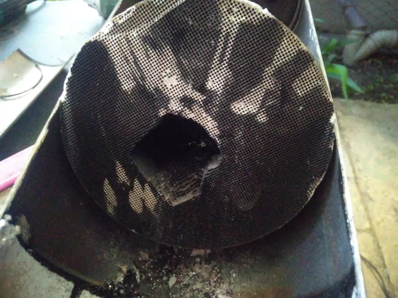 Вытаскиваем все по частях, оно легко разбирается на соты. И видим что катализатор уже немного начал прогорать, ровно в том месте где вход с трубы в саму банку. Значит таки пришло его время.