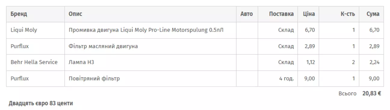Оливи в списку запчастин немає, бо на попередню заміну для Astra та BMW X3 ми вже закупили дві каністри 5W-40. Після тих робіт залишилось рівно 3 літри — якраз стільки, щоб не купувати зайве. Але прикупили 1 літр такої оливи за 290 грн щоб не забракло.
