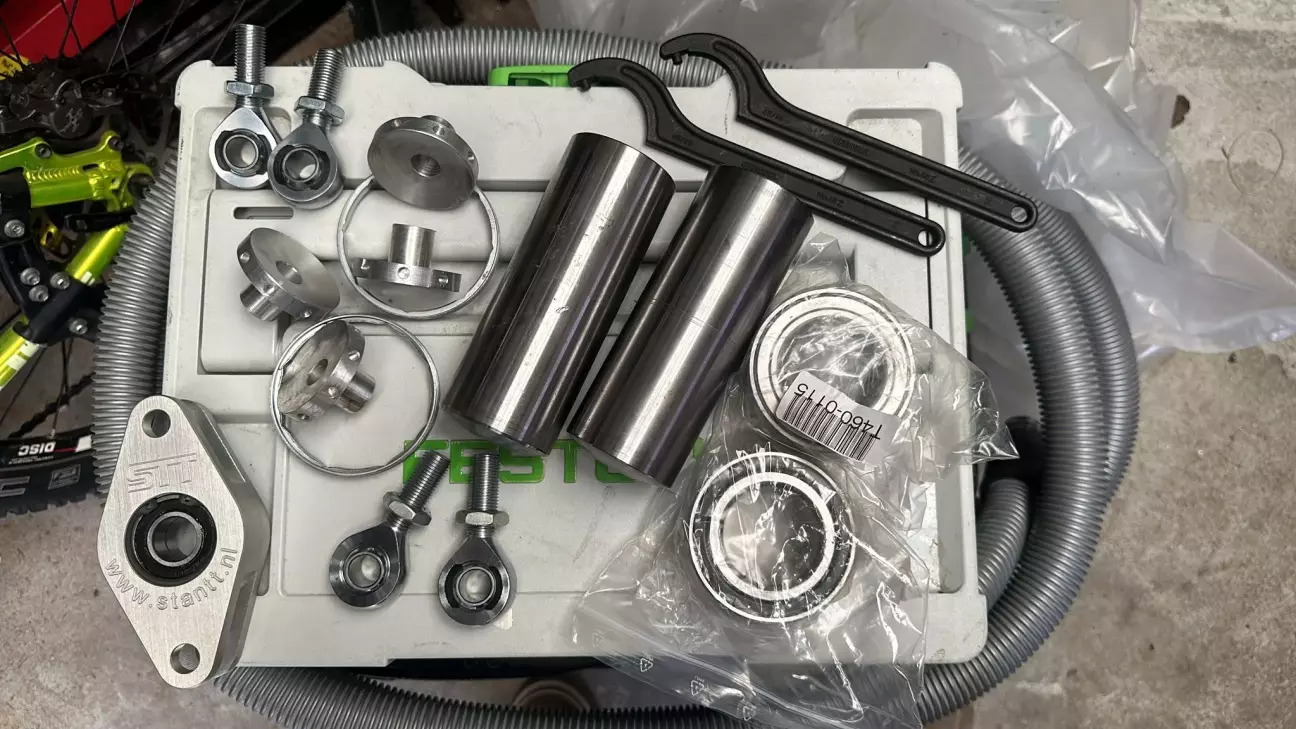 Вище показані втулки, мають ексцентриковий отвір також просверлений під кутом, що дозволяє регулювати нижню частину ступиці у всіх плоскостях у відносно невеликому діапазоні, але достатньому для виставлення сходження та кастору. Із першого фото, верхньою тягою регулюємо розвал у досить великому діапазоні.