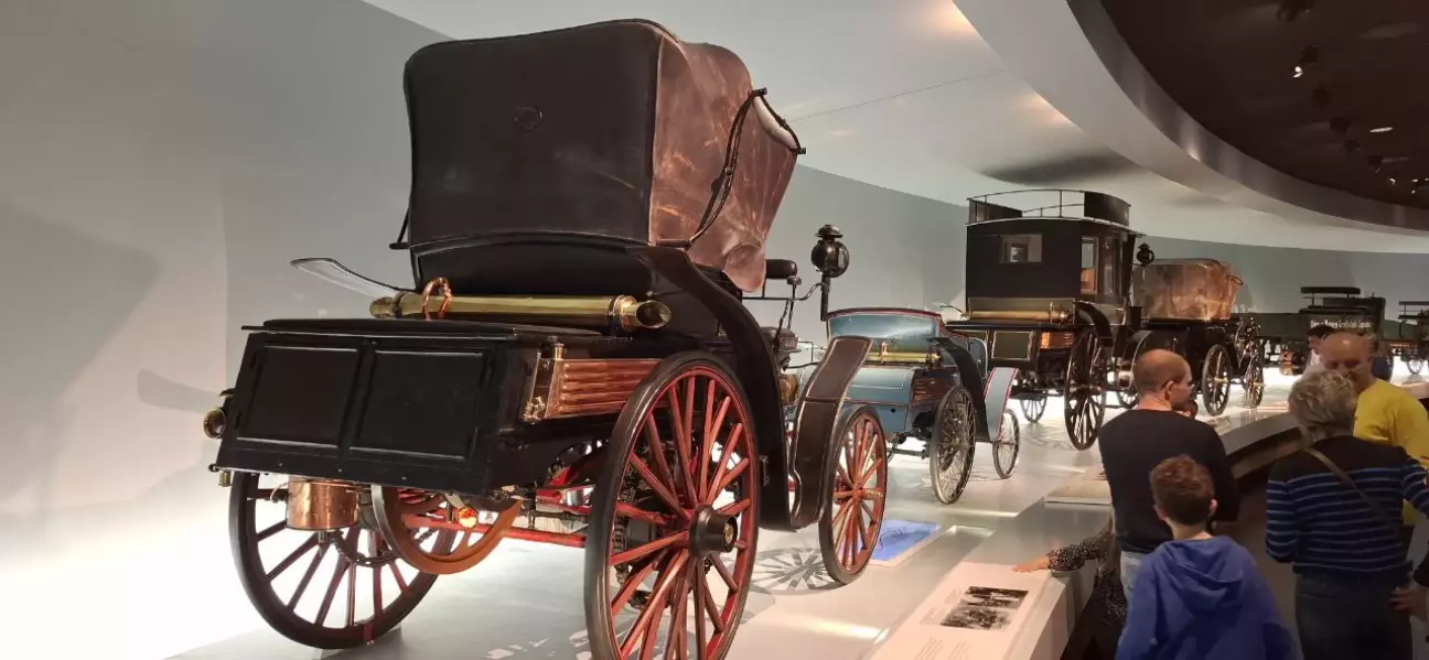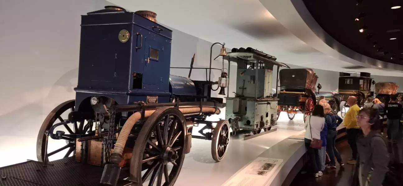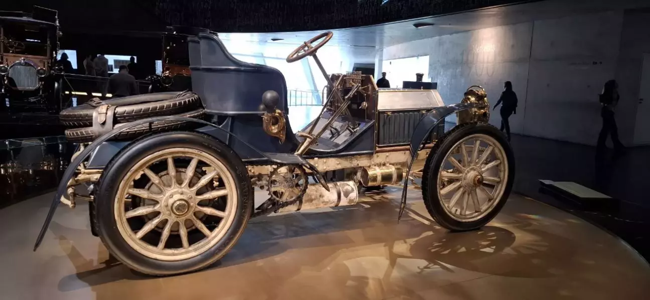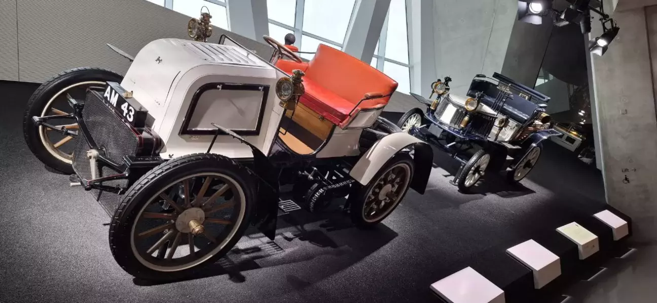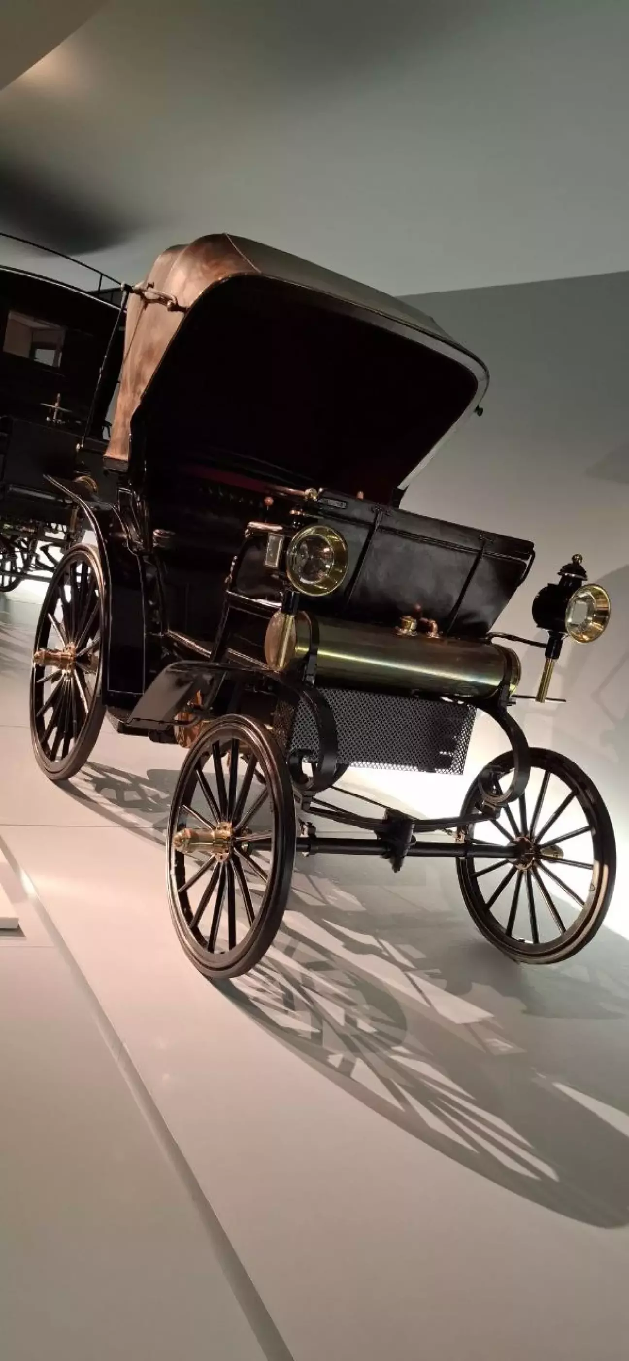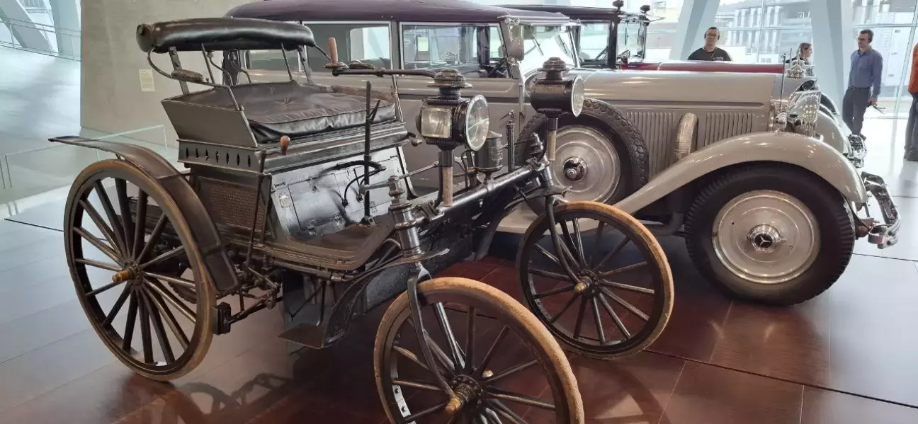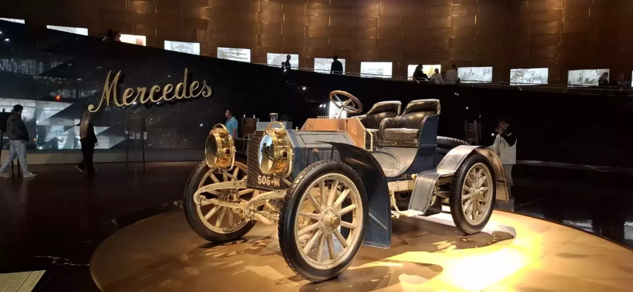 Придбали квітки в музей по 16 евро. В відгукав читав що можна пійти до адміністратора, сказати що українці та пройти безкоштовно. Я прошу вибачення, але це не для мене. Тим більш я сам працюю, заробляю гроші та не збираюсь принижуватись за такі нюанси. Після купівлі квітків нам видали навушники та аудіогіди. Це був першій музей , в який ми потрапили з такою послугою. Огляд починається з 7 поверху, куди групу єкскурсантів доставляє ліфт космічного виду з дизайном 50 років минулого століття. тут починається історія створення автомобільних виробів Мерседес, починаючи з білої лошаді. (ЇЇ не фотографував, бо вважаю що як вона виглядає всі й так розуміють))) Далі зал де розміщені самі перші авто Даймлера.