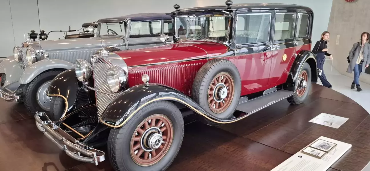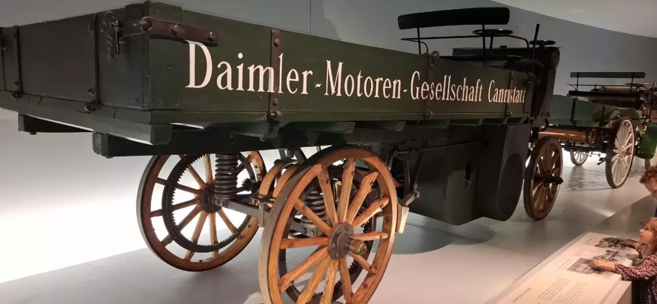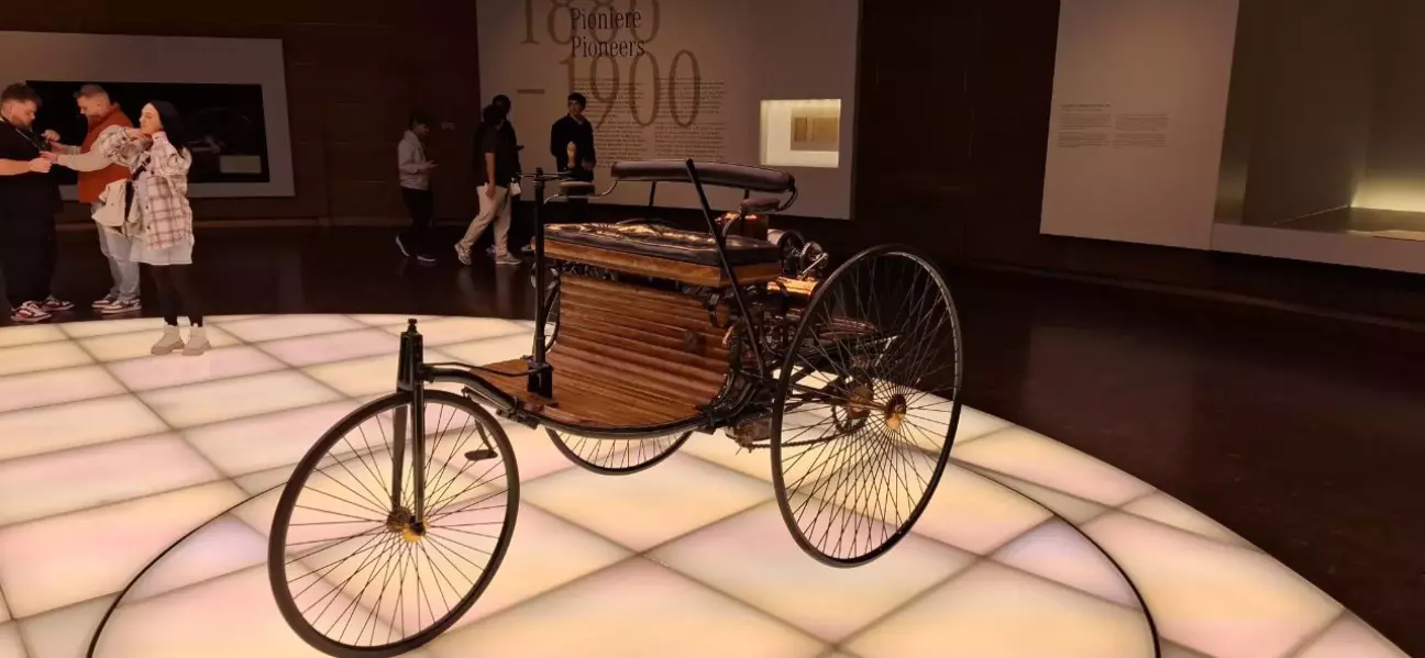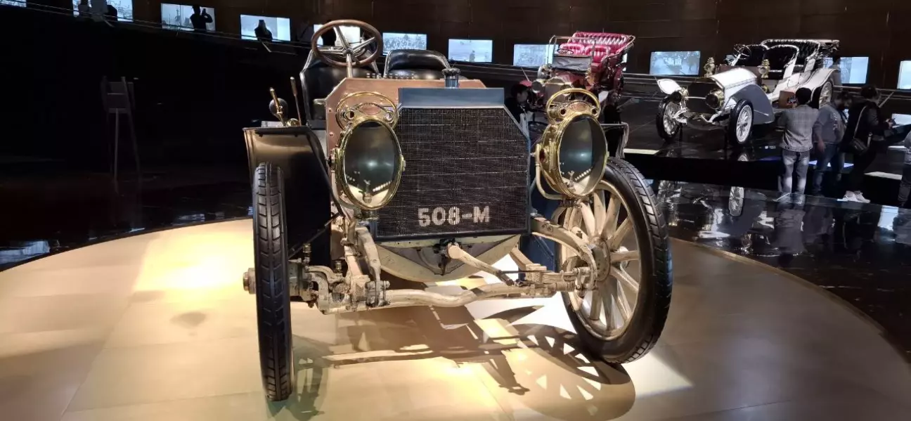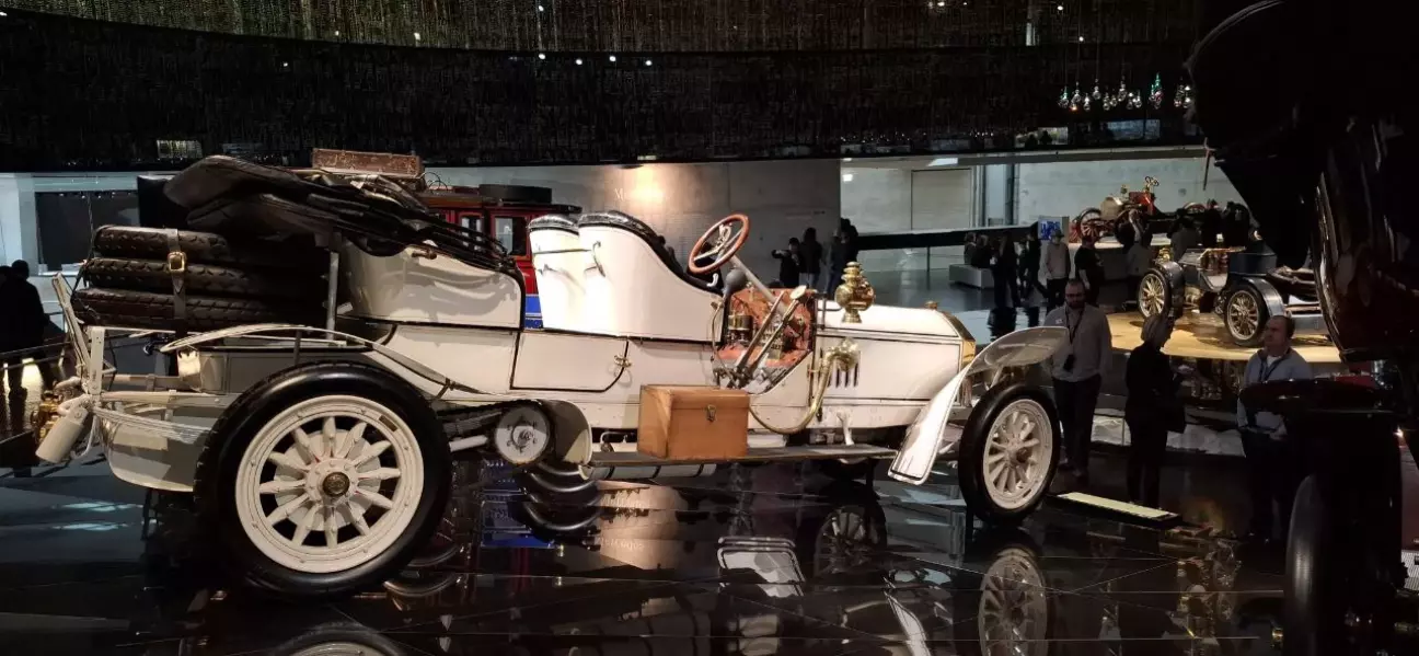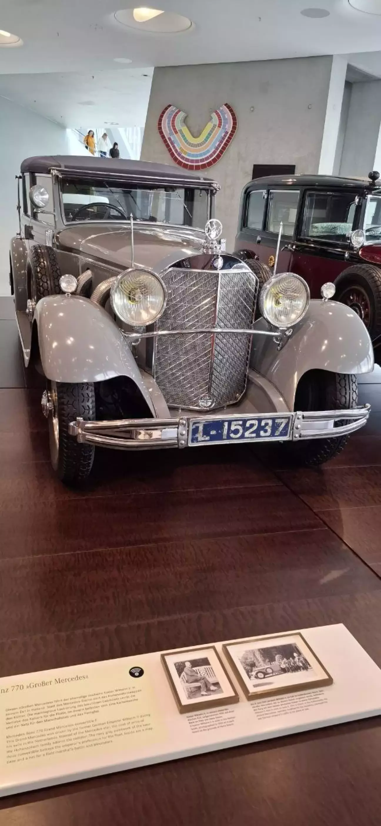 Придбали квітки в музей по 16 евро. В відгукав читав що можна пійти до адміністратора, сказати що українці та пройти безкоштовно. Я прошу вибачення, але це не для мене. Тим більш я сам працюю, заробляю гроші та не збираюсь принижуватись за такі нюанси. Після купівлі квітків нам видали навушники та аудіогіди. Це був першій музей , в який ми потрапили з такою послугою. Огляд починається з 7 поверху, куди групу єкскурсантів доставляє ліфт космічного виду з дизайном 50 років минулого століття. тут починається історія створення автомобільних виробів Мерседес, починаючи з білої лошаді. (ЇЇ не фотографував, бо вважаю що як вона виглядає всі й так розуміють))) Далі зал де розміщені самі перші авто Даймлера.
