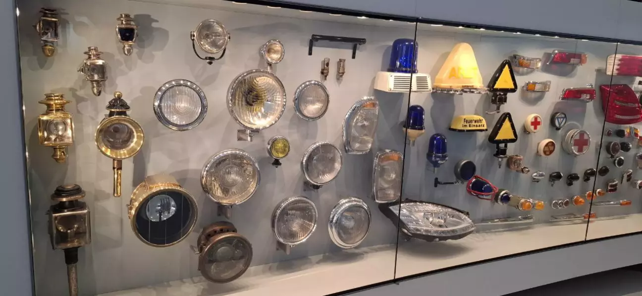 Стенд з різноманітними фарами авто. Фари старих авто як великі каструлі)