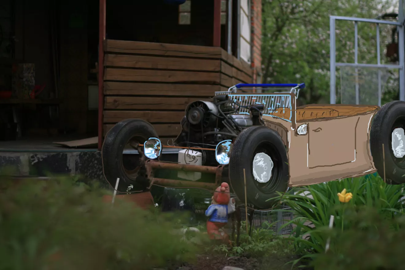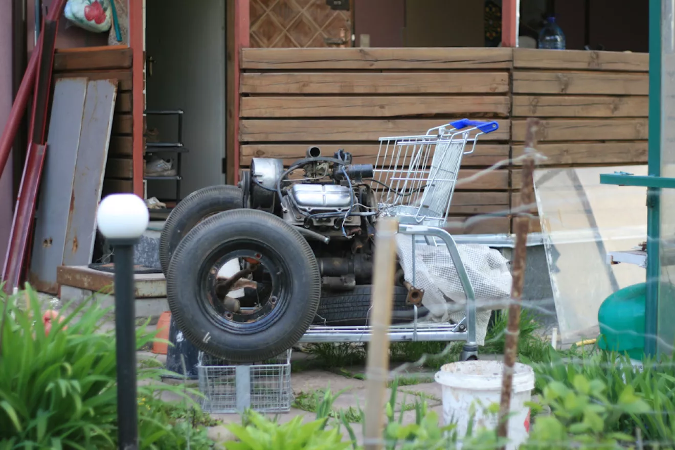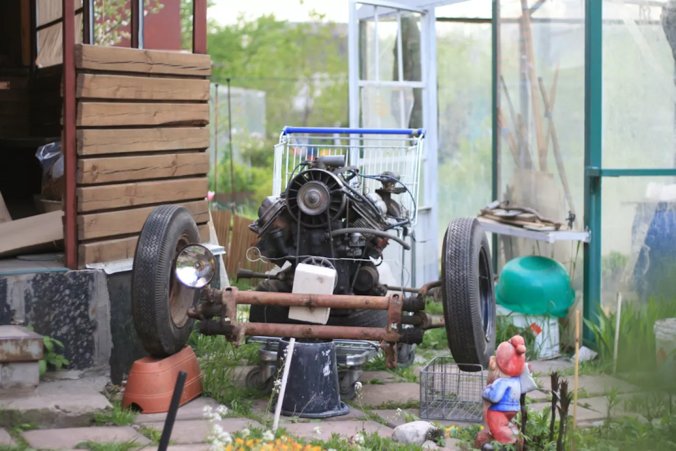 Я как то перед сном пытался отследить, когда же впервые в семью пришла идея постройки Хот Рода, путем перебора фотографий я пришел к тому, что это случилось 30.04.2014, как раз пора пробуждения после зимы, с новыми знаниями в бой мчались строить наш любимый 966 ЗАЗ. По стечению обстоятельств, кузов ЗАЗа зимовал на улице под тентом, а тем временем, после знатного урожая помидор, в теплой и сухой теплице в спячке находится ЗАЗовский МЕМЗ, удобно размещен на тележке из всем известного супермаркета. Весьма удобный вариант для постоянного перемещения, рекомендую. Так вот, в этот почти майский день, мы ту самую телегу с мотором тянули к самому ЗАЗу, и все другие пожитки за одно, предстояла большая работа, мы тогда стремились к "порогу". Когда все детали собрали в кучу, вырисовался весьма интересный и дико занимательный силуэт