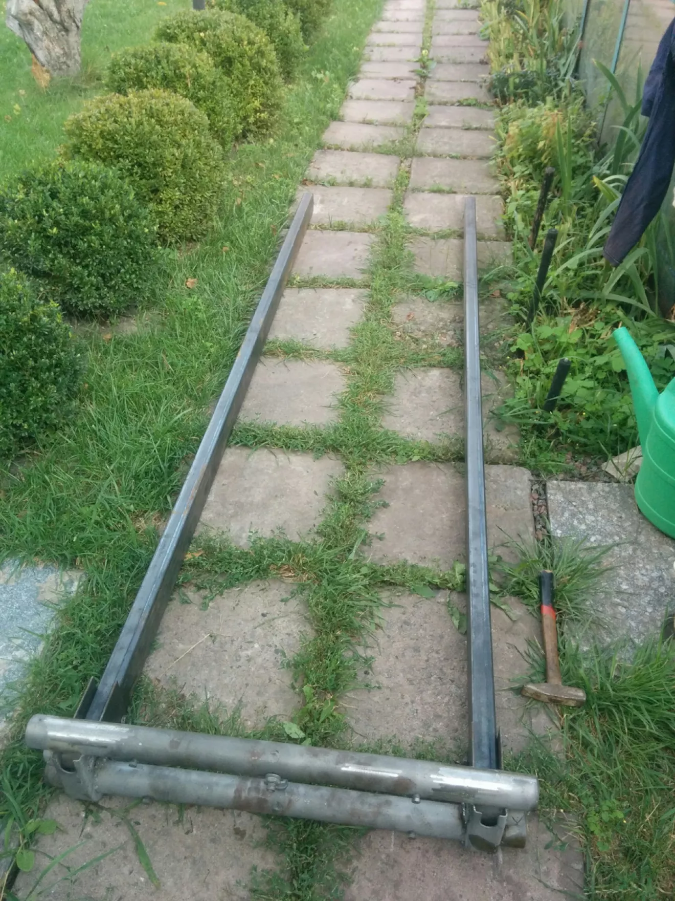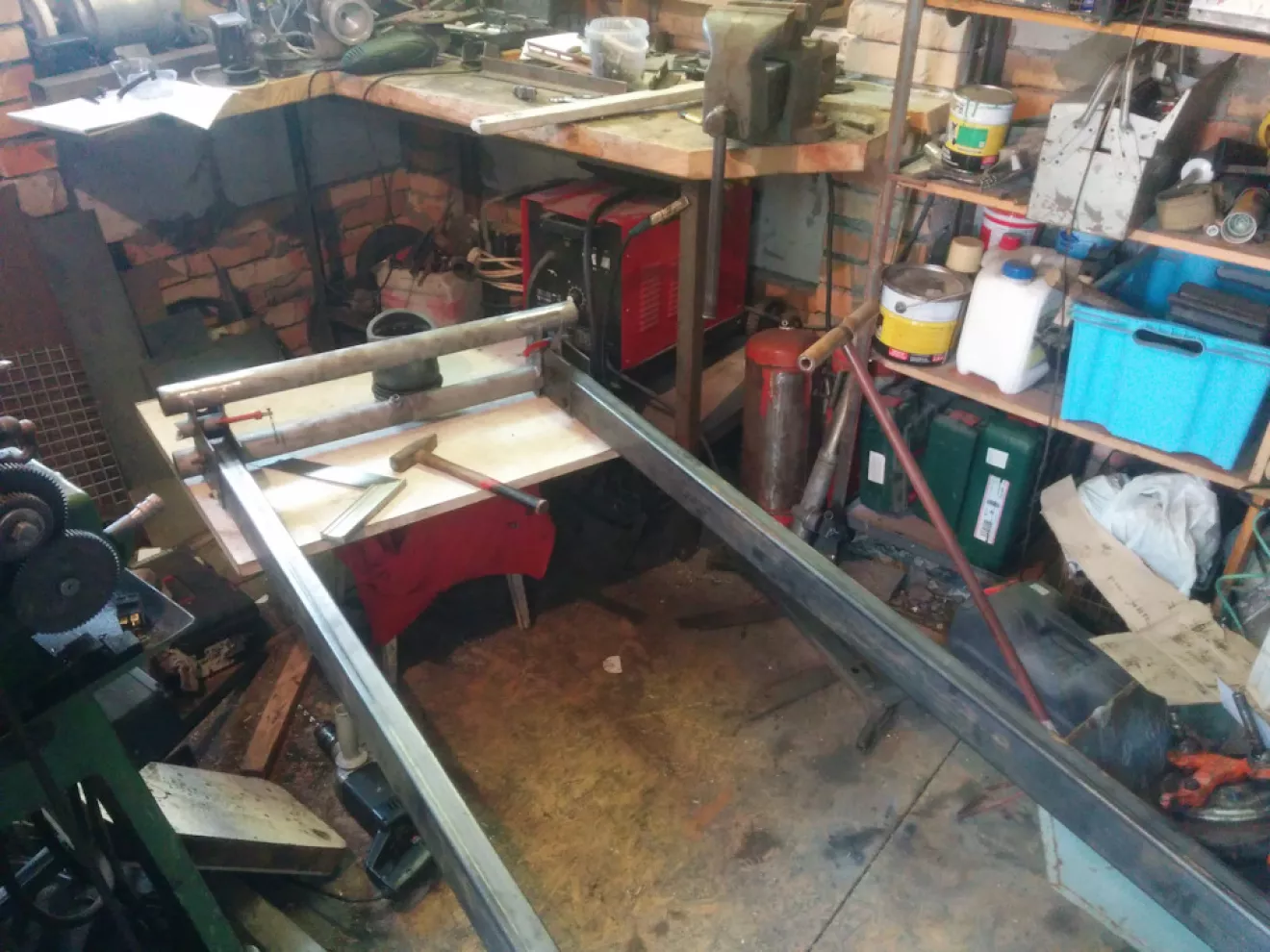 Мы просто поехали и купили квадрат трубу, которая нам понравилась. На двух табуретках по уровню и с помощью рулетки я выставил параллельность и геометрию рамы, переделал крепление балки торсиона, начало было положено.