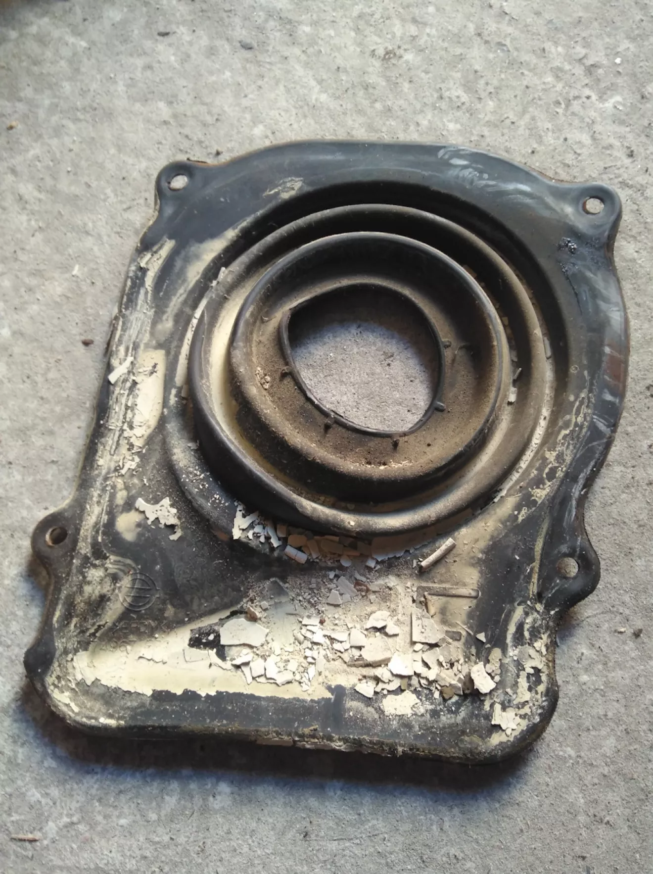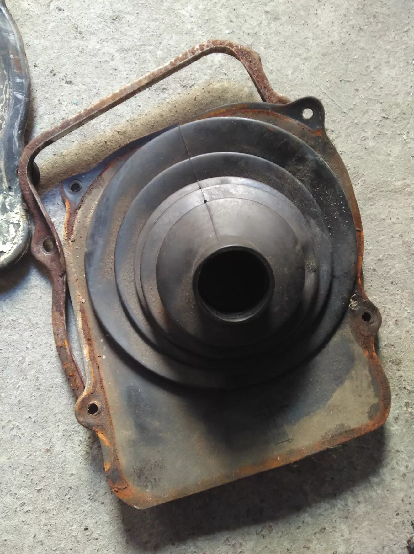 Тоже ничего сложного, снимаем подстаканники, снимаем пластик в месте с кожухом вокруг ручки КПП и вынимаем шумоизоляцию (похожа на минвату) Там нас встречает резиновый пыльник, его снимаем и видим другой пыльник прикрученный металлической рамкой на четыре болта м6 под головку на 10мм, все бы хорошо но, болты проходят насквозь кузова и с низу подвергаются воде и грязи, соответственно они выкручиватся не сильно хотели. Один из четырех я обломал, остальные три не спеша, с ВД40 по два оборота против часовой и один по часовой я открутил. Вид все это имело ужасный.