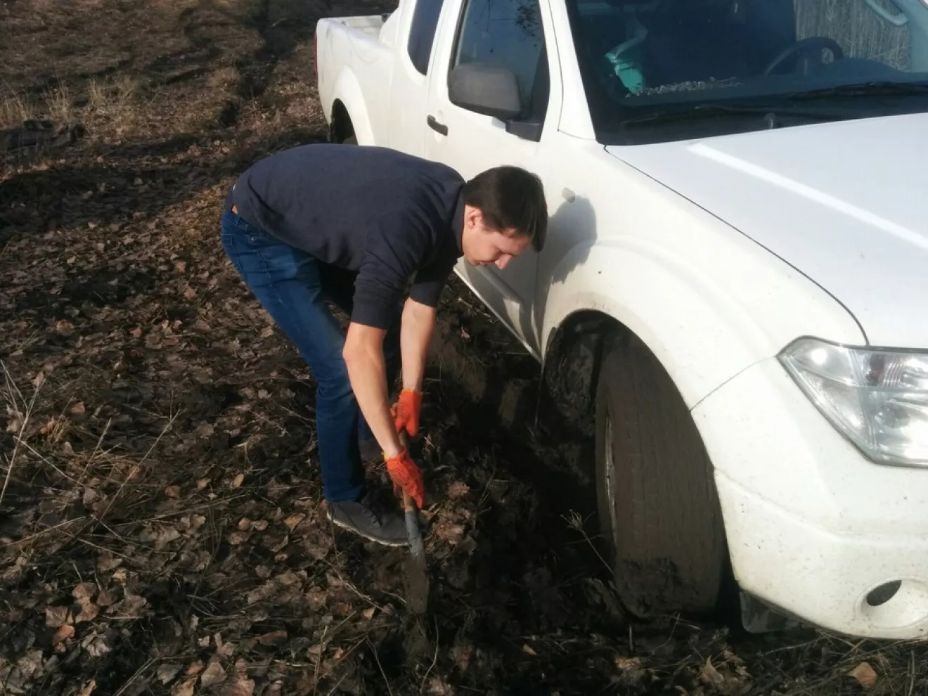 Подумал что блокировка исправит ситуацию и был не прав, переднее левое на пол колеса ушло в грязюку, стабилизатором я уперся в возвышение, что не давало двигаться вперед. задние колеса можно сказать на шару крутились, короче печаль. Я не был готов к подобному, одежда выходного дня, хорошо что были перчатки, лопата, топор, ну и трос (самое важное). Будучи зеленым в таких ситуациях я принялся откапывать все, что мешало, параллельно уже позвонив товарищу muzolya с просьбой о помощи.