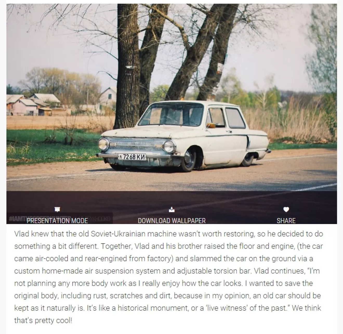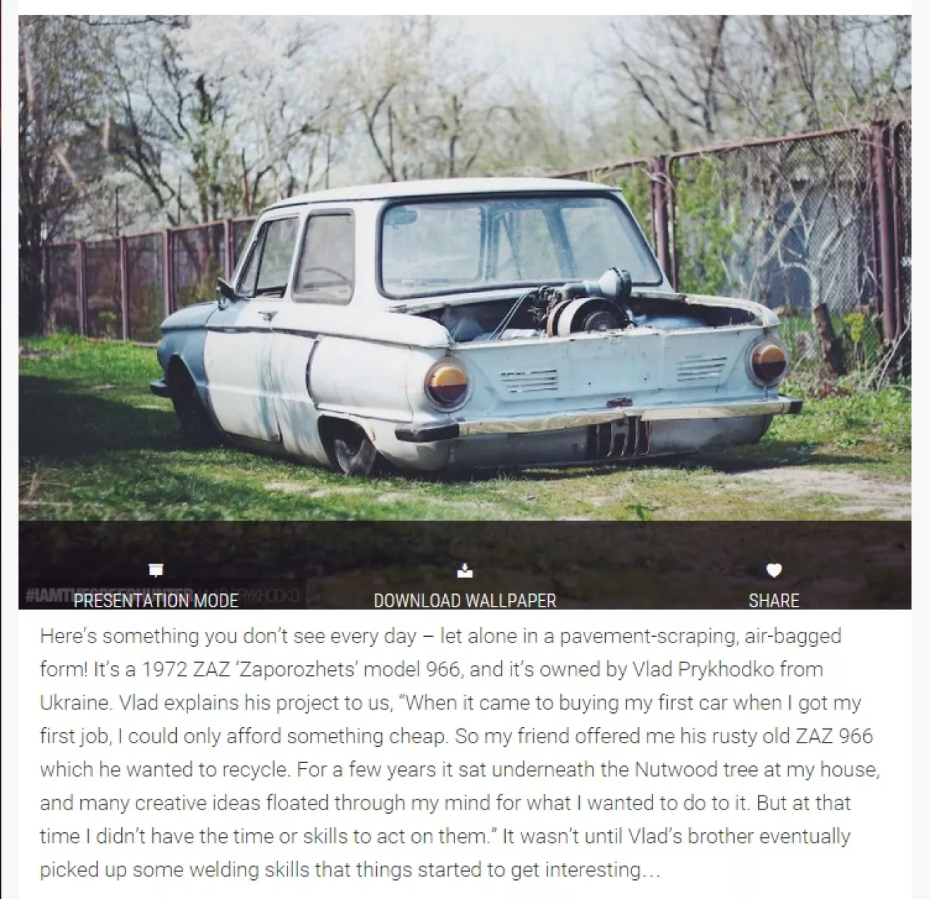 Буквально пару дней назад я узнал, что мой ЗАЗ попал на Speedhunters. Эта новость мягко сказать шокировала меня, имея ограниченный доступ к интернету, я около часа пытался открыть страницу, и в итоге действительно, 1972 ZAZ ‘Zaporozhets’ model 966 from Ukraine. Куча эмоций, ведь я понимаю, что это круче чем по телику, всемирно известный ресурс заценил проделанную мной работу — Спасибо!