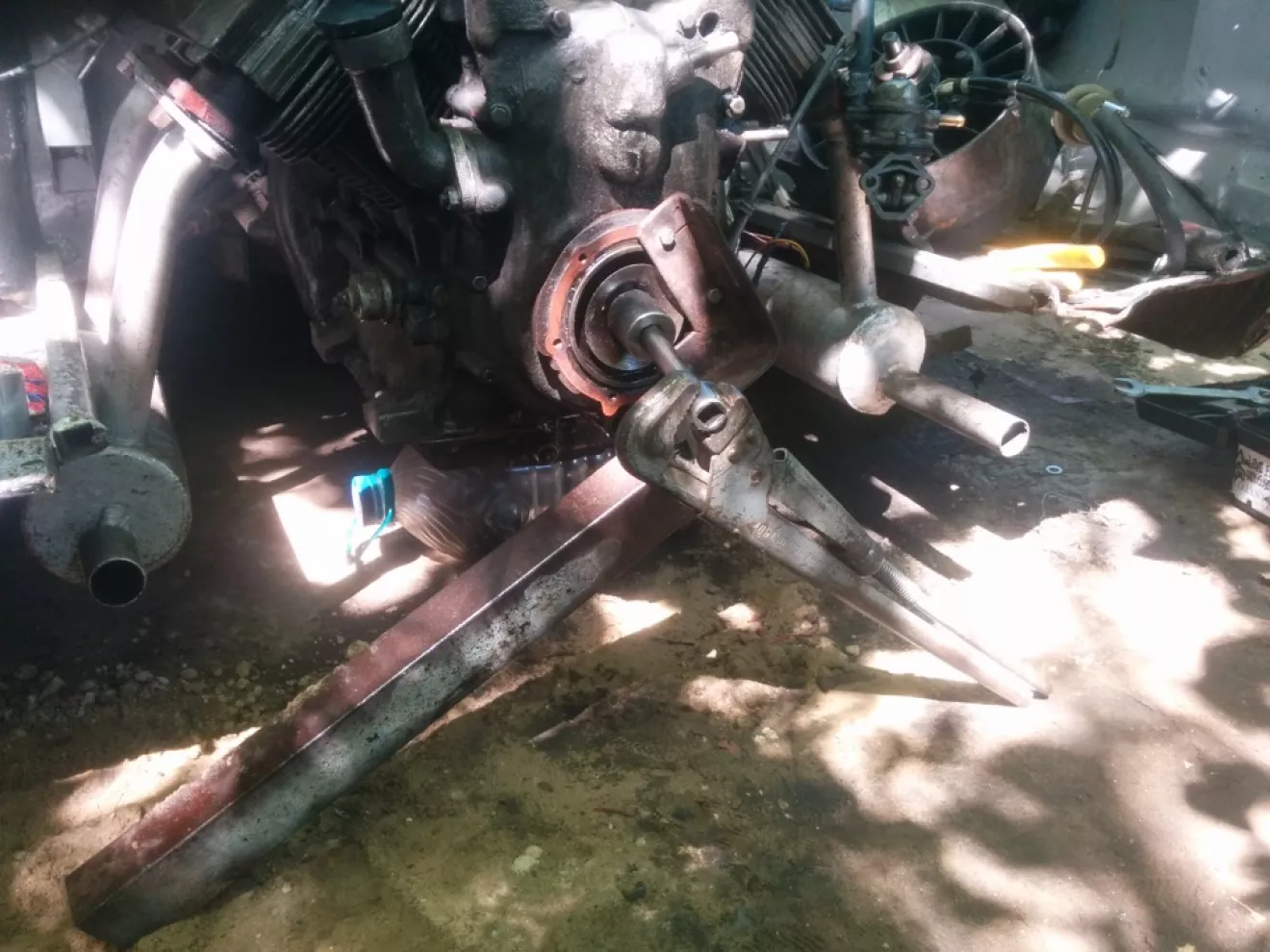 далее откручиваем 4 болта на 14 которые крепят генератор-вентилятор к крышке шестерен балансировочного вала и газоразпределения. Далее опускаемся ниже и откручиваем центрифугу, 6 болтов под ключ на 10 (будьте аккуратны, в ней есть масло, около 100 грамм). Далее веселее, мы видим так названый "специальный болт" на 27, который крепит чугунный …корпус центрифуги с маслоотражателем к коленвалу. По книге, этот болт нужно затягивать с силой в 20кгм, видимо тот кто его закручивал до меня, этого не знал и затянул как у нас в народе принято. Я е6ался с ним сутки, коленвал прокручивается, первая, вторая, задняя, да один хрен, нет упора и все. Свой набор stanley я забыл дома и пришлось откручивать китайским дерьмом, головка на 27, удлинитель 10см, и вороток 30см. Вороток я гнул и ровнял раза три, после чего выкинул. Головка не многогранная, а шестигранная от чего и облизывала болт и срывалась, я был на грани того, что слижу болт в круг и уже вовсе не откручу. Подкинули идейку как заблокировать коленвал, что бы появился упор, собрав остаток сил, решился на отчаянный и как я себя тогда убеждал, дибильный шаг. Взял обыкновенный уголок, просверлил в нем три отверстия, прикрутил подходящими болтами на места крепления центрифуги, одел на него разводной ключ, на ключ квадратную трубу 60х40, упер в землю, одел головку на болт, подбил молотком, вставил удлинитель и так как воротка уже не было, нашел трубный (газовый) ключ немалых размеров, и вцепился им за удлинитель,
