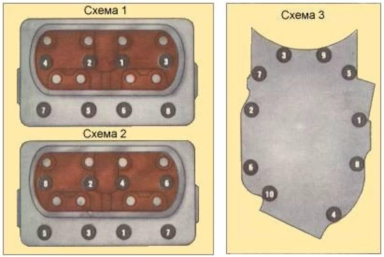 Процесс сборки в обратном порядке. 10 болтов крепящие крышку затягивать нужно в правильном порядке, указанном в книге, или на картинке схема 3