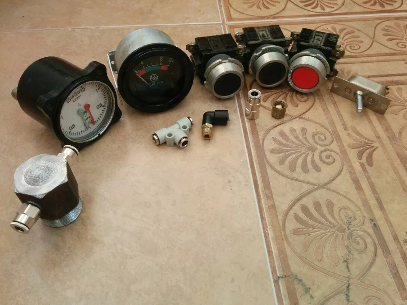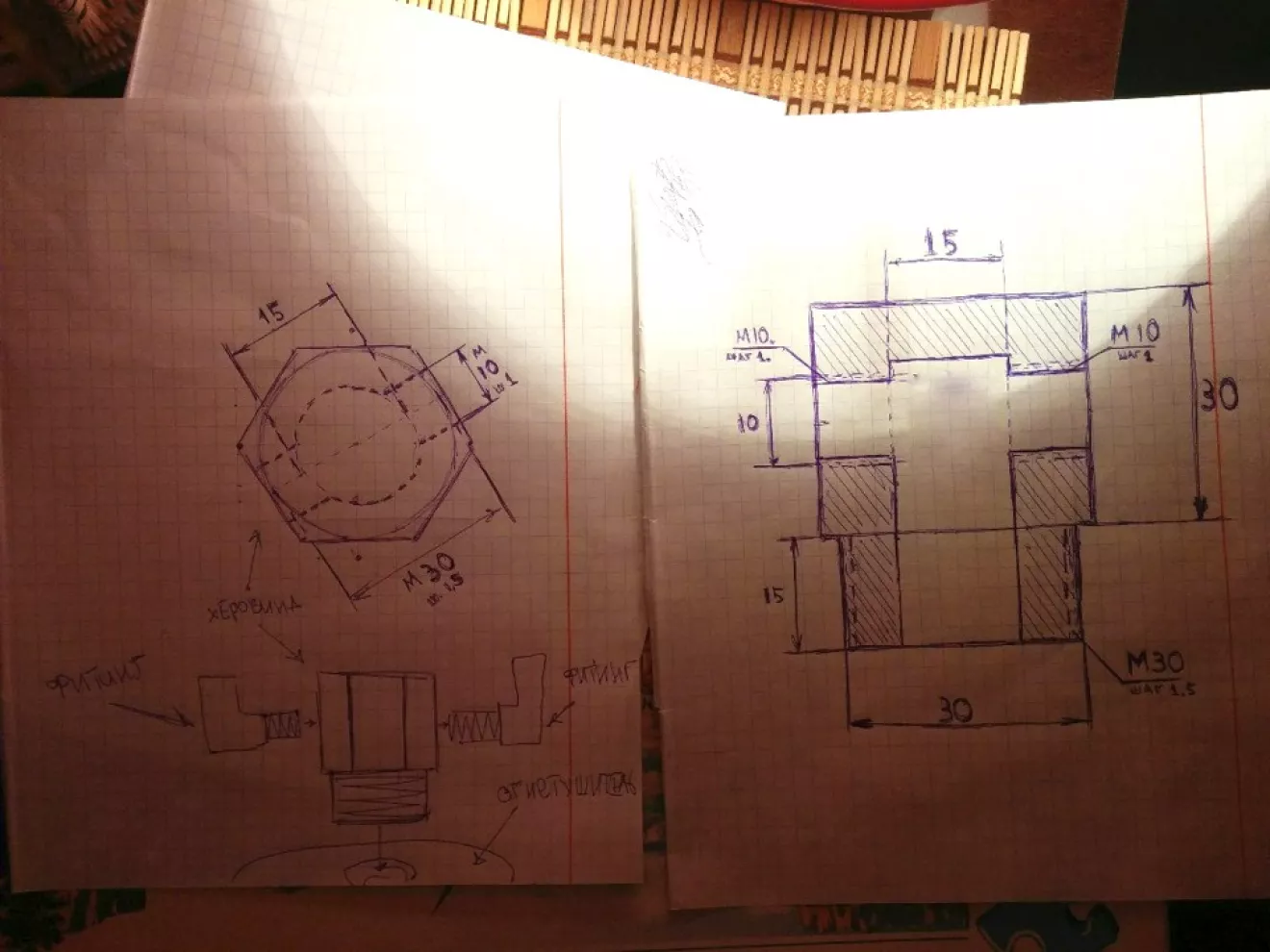 Посреди зимы я купил пару огнетушителей, по 10л каждый, честно говоря для других целей, но все обломалось и я решил один использовать в качестве ресивера. Первой головоломкой для меня стало соединение его с компрессором и всем остальным, так как это даже не камазовский ресивер, в нем нет ни одного штуцера, а только лишь одно отверстие с неординарной резьбой. Поднадоев нескольким людям я вышел на токаря, и на скорую руку набросал эскиз детали. За символичную сумму в 60грн ~2.5$, дядя Коля выточил ее безо всяких проблем. Следующим этапом стала покупка всей мелочевки, так как появился ресивер появилась и нужда в еще одном клапане, соответственно еще нескольких фитингов. Курс доллара скакнул выше облаков и цены на фитинги на месте не остались, вот я и набросал схему с минимальными затратами, купил фитинги и за одно пару кнопок и тумблер. От манометра на давление в контуре пришлось отказаться, слишком дорого.