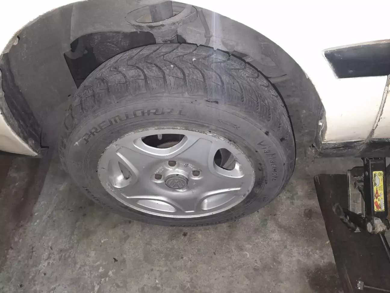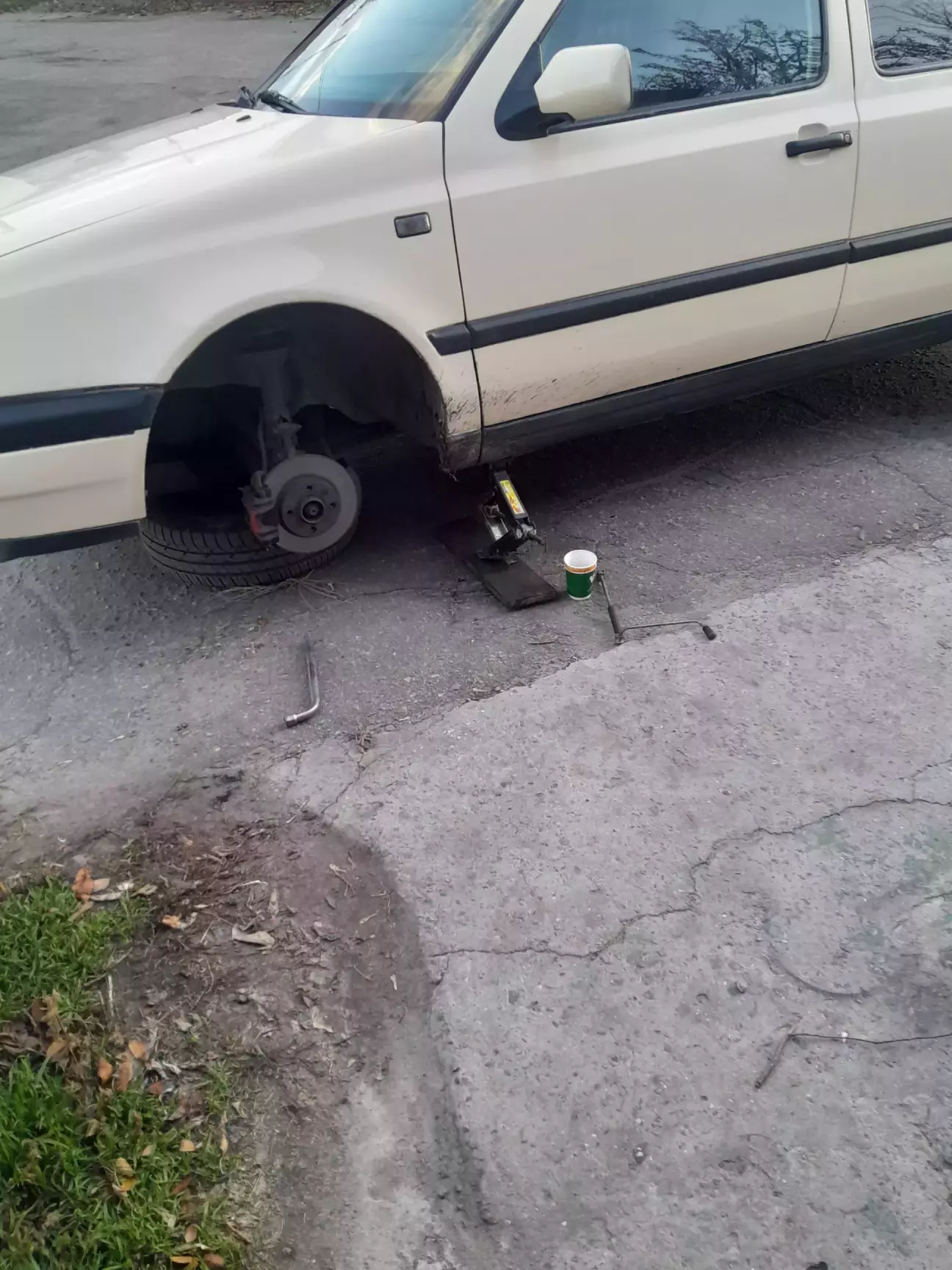 Перевзувся на зиму. Якщо хто не знав, за передній піддомкратник, коли височенько підняти, вивісити можна два колеса штатним домкратом. Так зручніше при перевзуванні, або при ротації коліс.