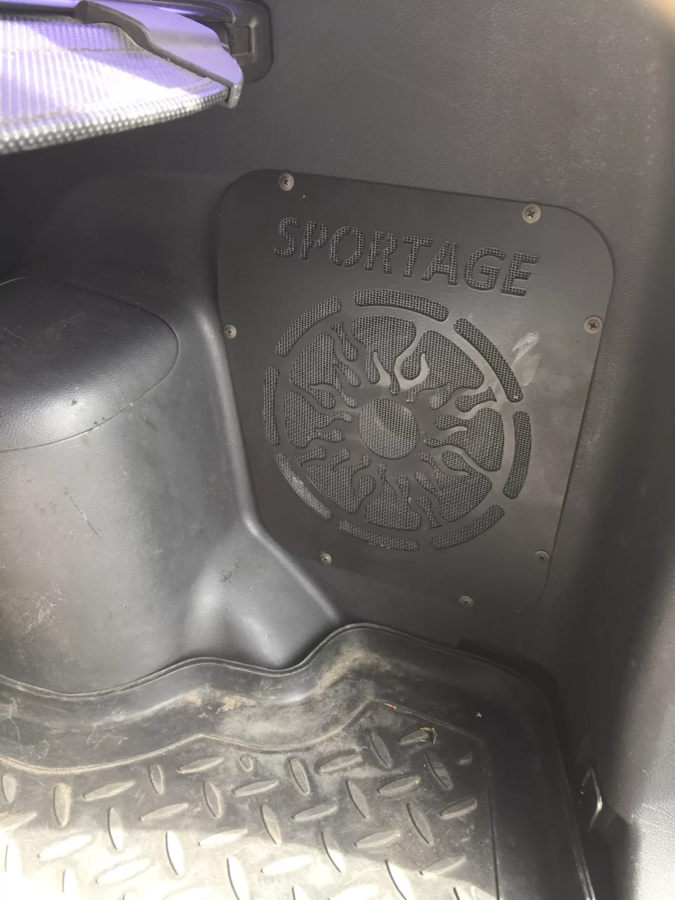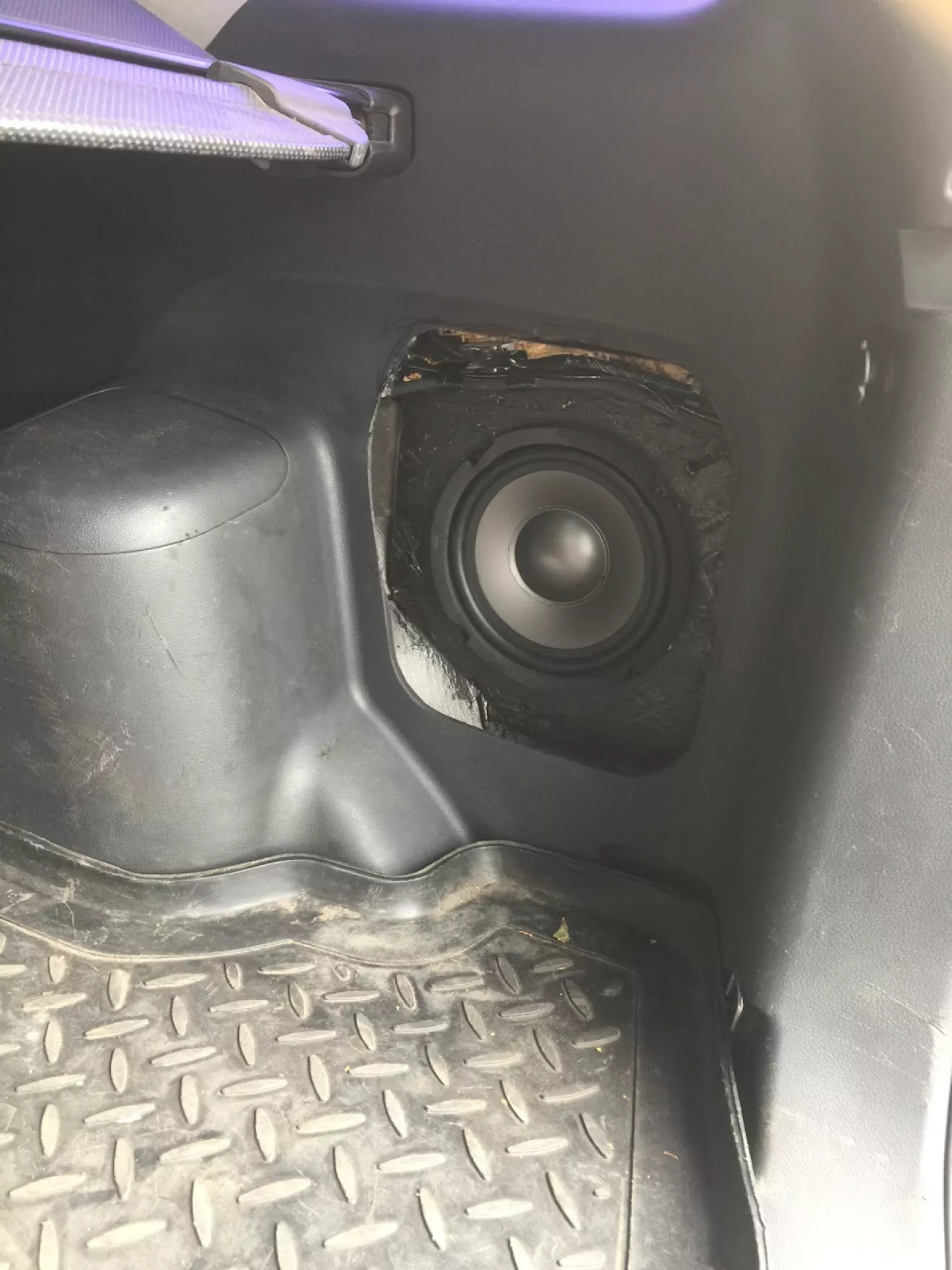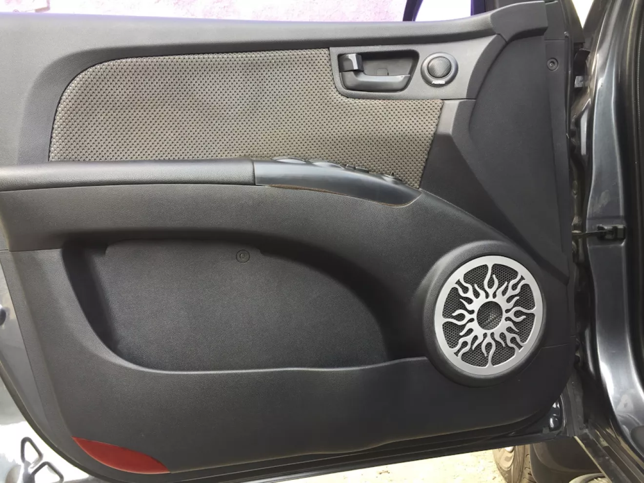 Было свободное время на работе для творчества и договорившись со своими конструкторами вырезали на лазере Гриши для динамиков в двери. В начале идея состояла в удалении родных сеток, чтобы было видно «титановый» диффузор, но приглядевшись, увидел несовпадение окружности динамика с окружностью сетки. Поэтому просто установил гриль поверху сетки. После сделал сабвуфер (просьба сильно не пинать, мне нравится и мне хватает). К линейному выходу Баса в голове, подключил НЧ усилитель из поднебесной с питанием от розетки в багажнике и все спрятал под обшивкой (фото не сделал). Крыло изнутри обклеил виброй и битопластом10 (типа корпус) и на фанеру установил НЧ динамик. Сверху на пластик прокрутил вырезанную на лазере крышку-гриль.